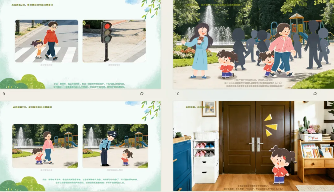 小结:假期时,路上车辆很多。我们一定要牵好家长的手,不在马路上奔跑玩耍。过马路时,一定要走斑马线(人行横道),并且遵守“红灯停,绿灯行”的交通规则。