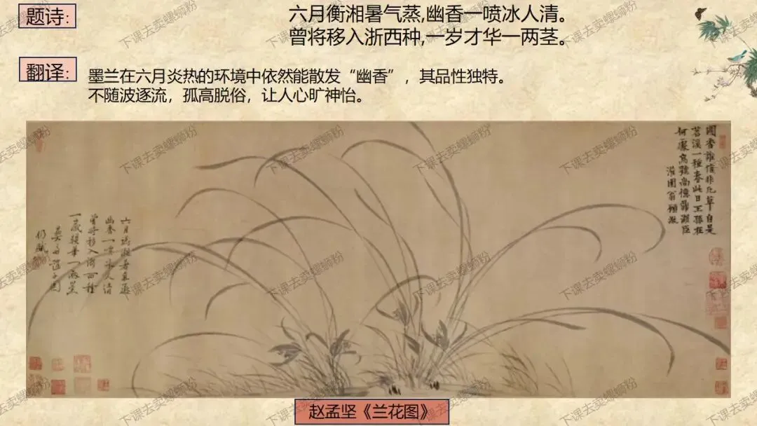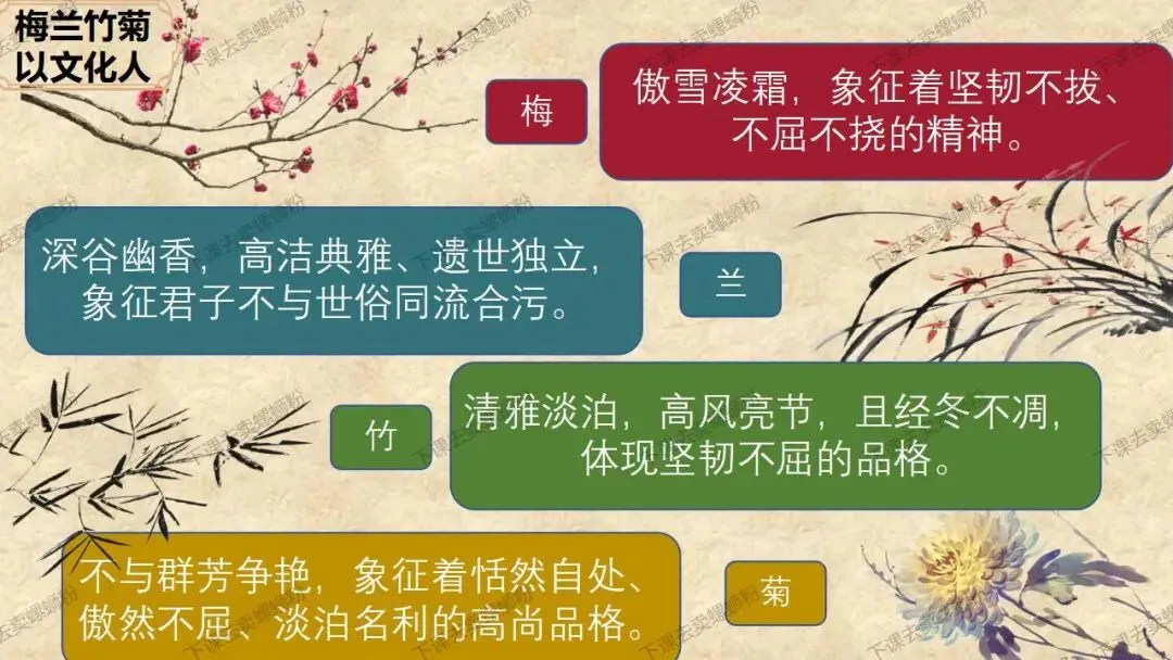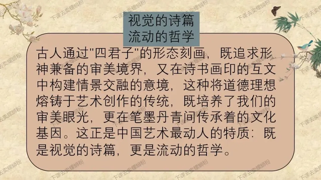 梅的凌霜、兰的幽谷、竹的劲节、菊的傲骨,既是笔墨间跃动的自然风骨,更是艺术家寄托人格理想的载体。古人通过"四君子"的形态刻画,既追求形神兼备的审美境界,又在诗书画印的互文中构建情景交融的意境,这种将道德理想熔铸于艺术创作的传统,既培养了我们的审美眼光,更在笔墨丹青间传承着的文化基因。这正是中国艺术最动人的特质:既是视觉的诗篇,更是流动的哲学。