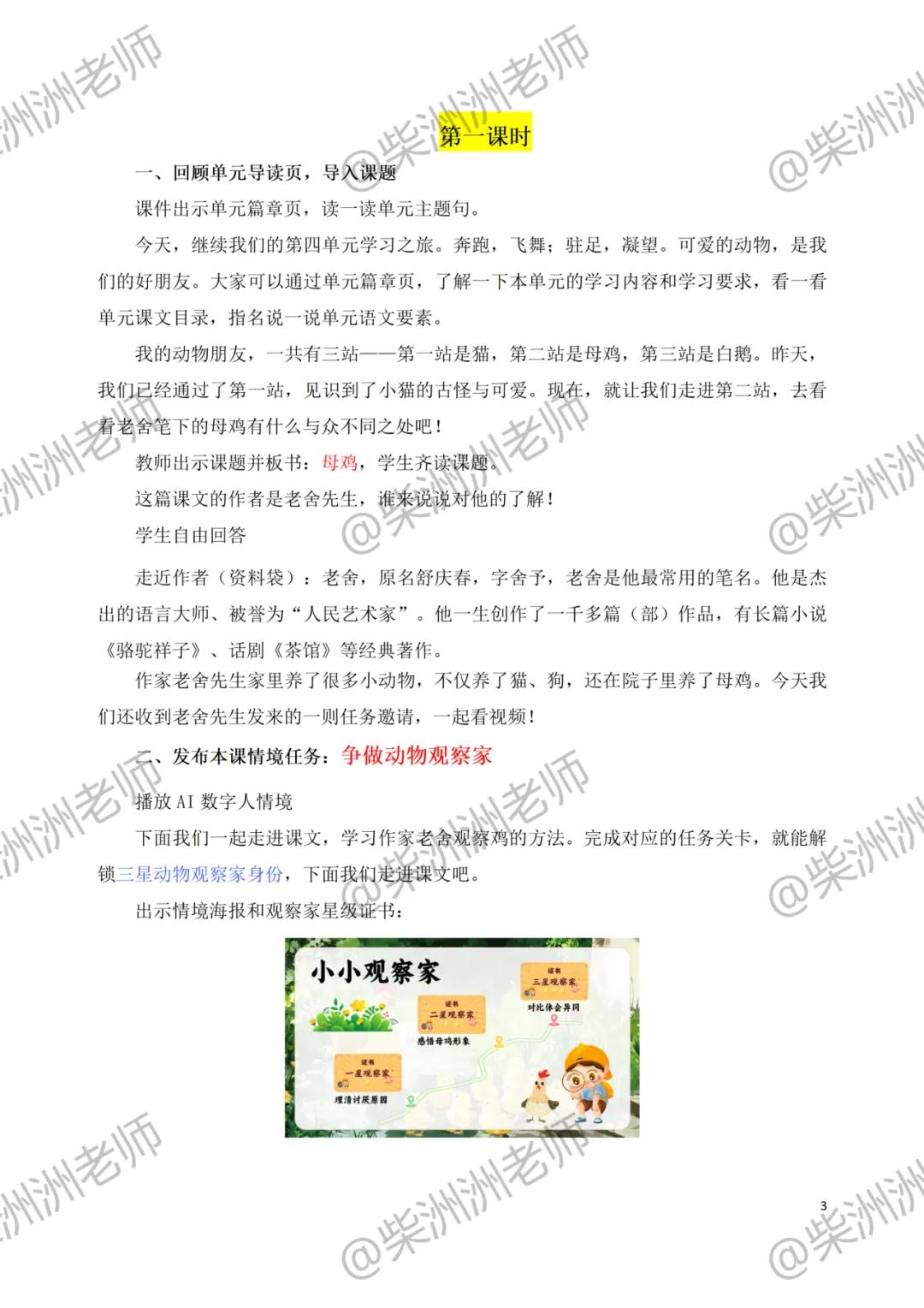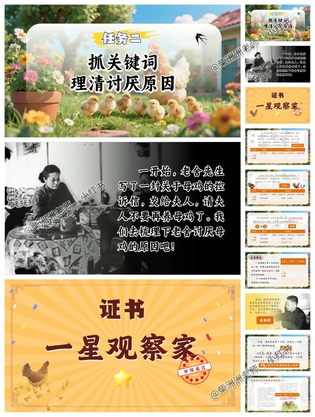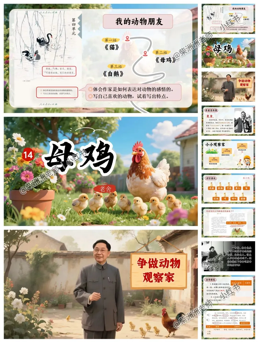 AI赋能!四下《母鸡》公开课课件+教案+学习单!争做动物观察家