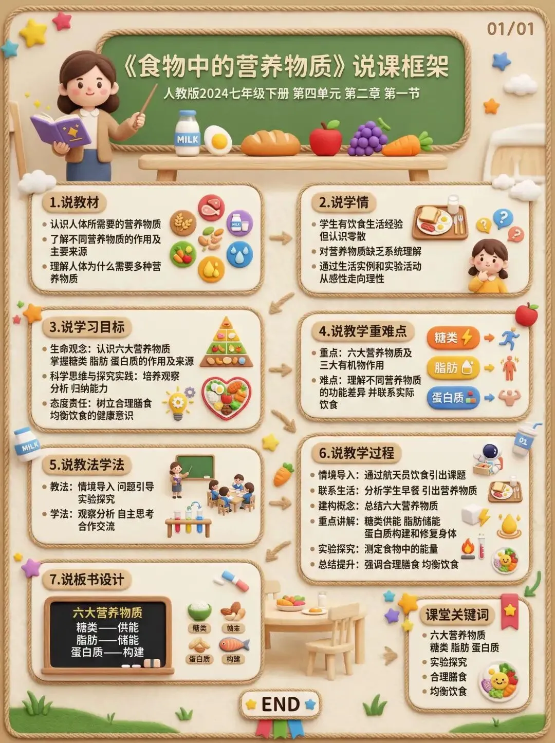 以上就是我对《食物中的营养物质》这一课的说课。我的设计思路是从生活实际出发,以问题为引领,以活动为载体,以健康观念培养为落点,让学生在真实情境中学习知识,在探究过程中发展能力,在联系生活中提升素养。