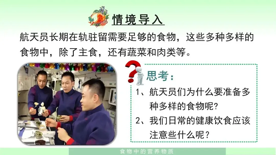 第一,情境导入法。借助航天员在轨饮食这一真实情境,引导学生思考“为什么要吃多种多样的食物”,让学生在问题驱动下进入学习状态。