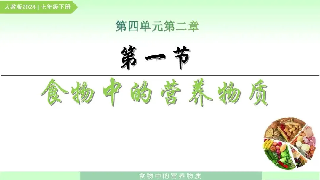 《食物中的营养物质》是人教版2024七年级下册第四单元第二章第一节的内容。本节课主要引导学生认识人体所需要的营养物质,了解不同营养物质的作用及主要食物来源,并进一步理解人体为什么需要多种营养物质。