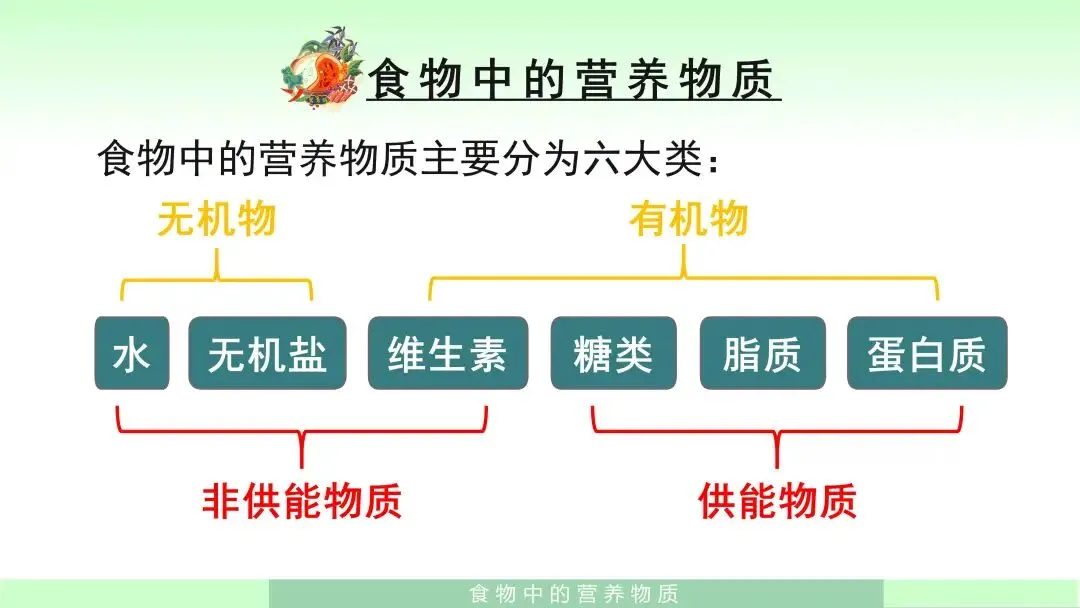 在学生交流的基础上,我会进一步引导学生归纳:食物中的营养物质主要分为六大类,分别是水、无机盐、维生素、糖类、脂质和蛋白质。随后,结合课件中的分类图示,引导学生明确:其中水和无机盐属于无机物,维生素、糖类、脂质和蛋白质属于有机物;同时,还可以从是否供能的角度进行认识,其中糖类、脂质和蛋白质是供能物质,而水、无机盐和维生素属于非供能物质。