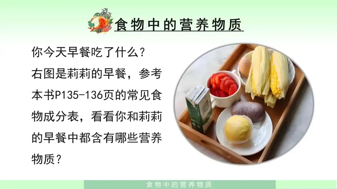 接下来,我会请学生结合自己的生活实际,说一说“你今天早餐吃了什么”。在学生自由发言后,我再展示课件中“莉莉的早餐”,引导学生观察这些食物,并结合课本中的常见食物成分表思考:你和莉莉的早餐中都含有哪些营养物质?