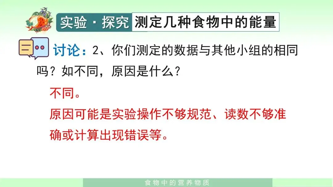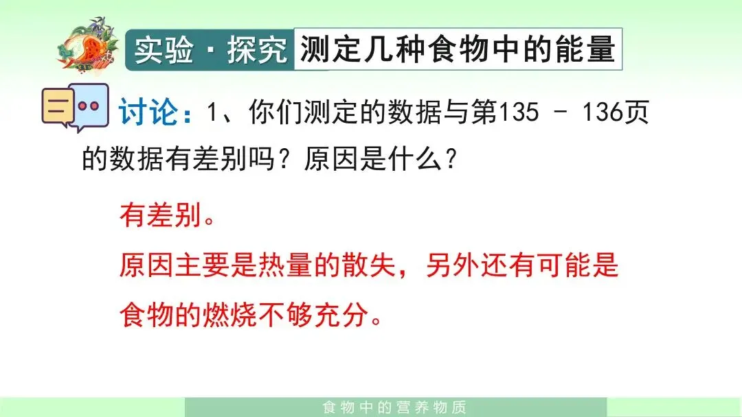 在这个环节中,我会让学生重点关注实验中的问题提出、计划制定以及数据分析思路,而不仅仅把实验当作操作过程。这样设计的目的是让学生从“食物中含有营养物质”进一步走向“食物中营养物质可以释放能量”的科学理解,使知识更加具体、可感、可验证。