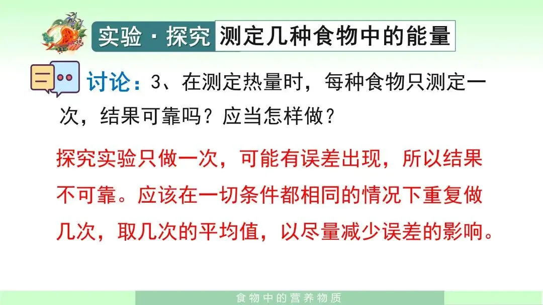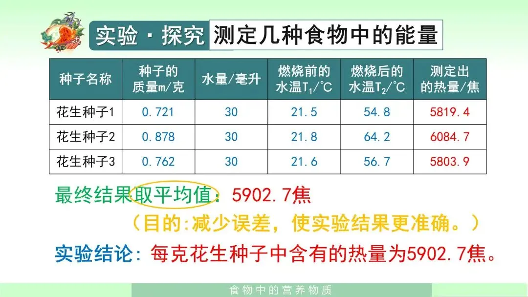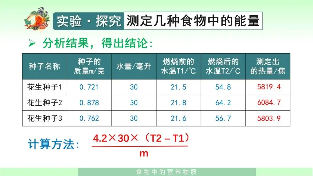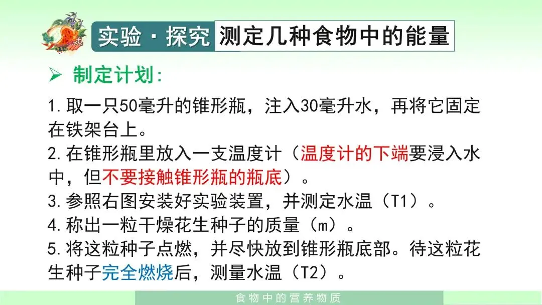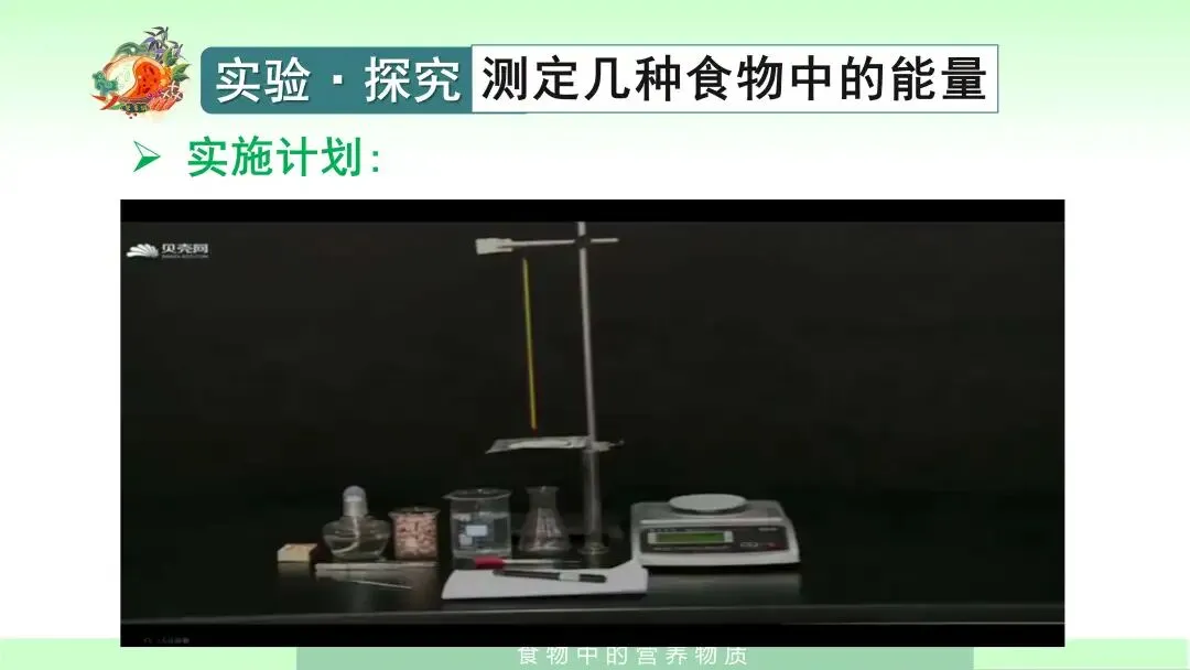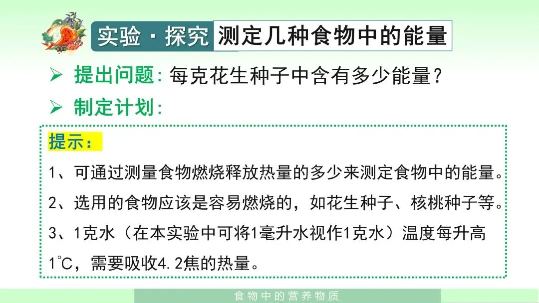 在学生已经掌握基本知识之后,我会组织学生进入实验探究环节——测定几种食物中的能量。我先引导学生提出问题:每克花生种子中含有多少能量?接着指导学生明确实验思路:可以通过测量食物燃烧时释放热量的多少来测定食物中的能量。课件中还给出了实验提示,如选择容易燃烧的食物,例如花生种子、核桃种子等;并告诉学生,在本实验中可将1毫升水视作1克水,1克水温度每升高1摄氏度,需要吸收4.2焦的热量。