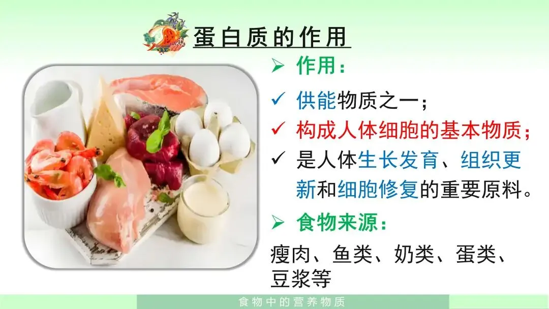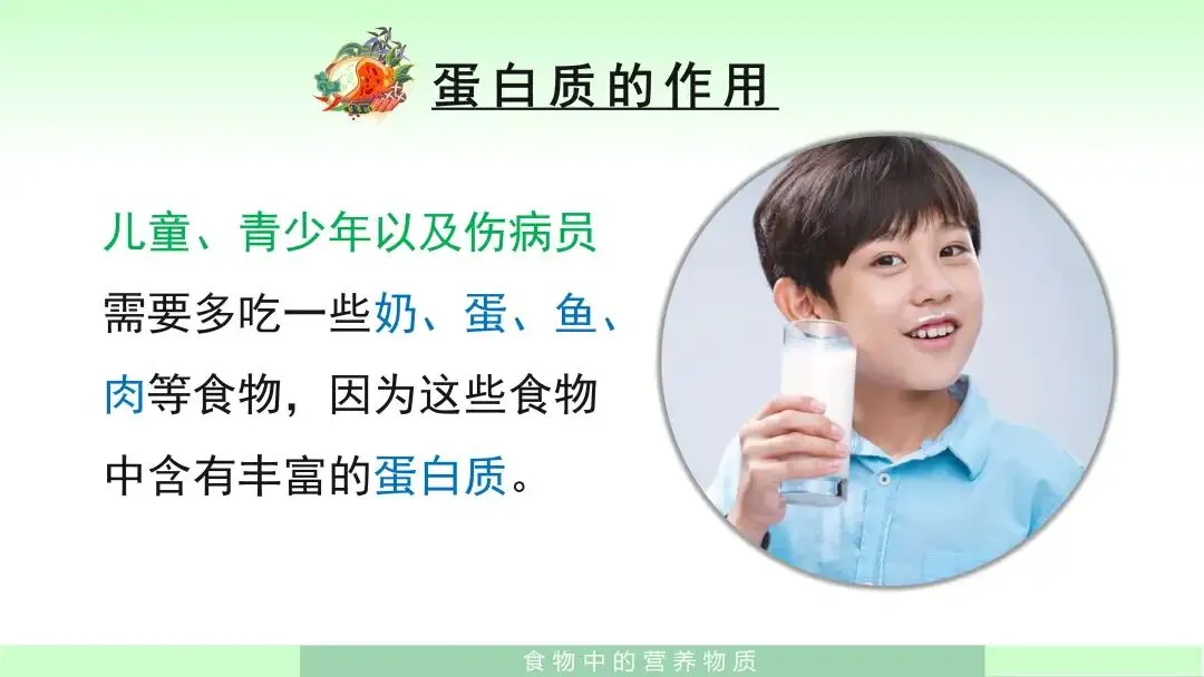 最后,在学习蛋白质时,我会引导学生结合课件总结:蛋白质不仅是供能物质之一,更重要的是它是构成人体细胞的基本物质,也是人体生长发育、组织更新和细胞修复的重要原料。它的主要来源包括瘦肉、鱼类、奶类、蛋类和豆浆等。随后我会结合课件中的生活案例进一步说明:儿童、青少年以及伤病员需要多吃一些奶、蛋、鱼、肉等食物,因为这些食物中含有丰富的蛋白质。通过这一案例,学生能够认识到蛋白质对身体成长和修复的重要意义。