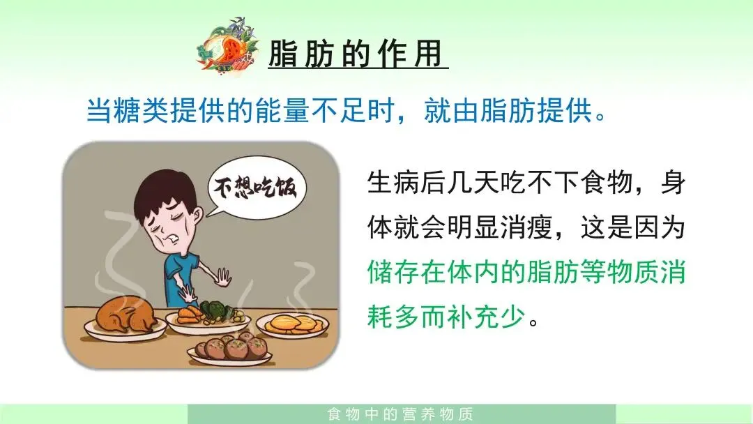 本课的教学难点是理解人体为什么需要多种营养物质,以及不同营养物质在人体中的功能差异。特别是学生容易简单地把“有营养”等同于“对身体好”,却不容易真正理解糖类、脂肪和蛋白质分别承担怎样不同的生理功能。因此,我会借助课件中的典型生活问题来突破难点,比如通过“病人静脉注射葡萄糖液”帮助学生理解糖类是重要的能源物质,通过“生病后消瘦”帮助学生理解脂肪是备用能源物质,通过“儿童青少年和伤病员需要多吃奶、蛋、鱼、肉”帮助学生理解蛋白质是构成人体细胞和促进生长修复的重要原料。