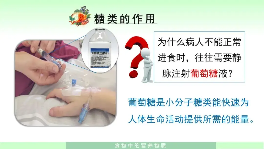 首先,在学习糖类时,我会引导学生结合课件归纳:糖类包括葡萄糖、蔗糖、淀粉、麦芽糖等,主要来源于面包、谷类、薯类等食物,它是人体重要的能源物质。然后我会进一步提出问题:为什么病人不能正常进食时,往往需要静脉注射葡萄糖液?让学生联系生活经验思考,并在此基础上得出结论:葡萄糖属于小分子糖类,能够快速为人体生命活动提供所需能量。通过这个问题,学生可以更深入地理解糖类的重要作用,而不只是停留在记忆层面。