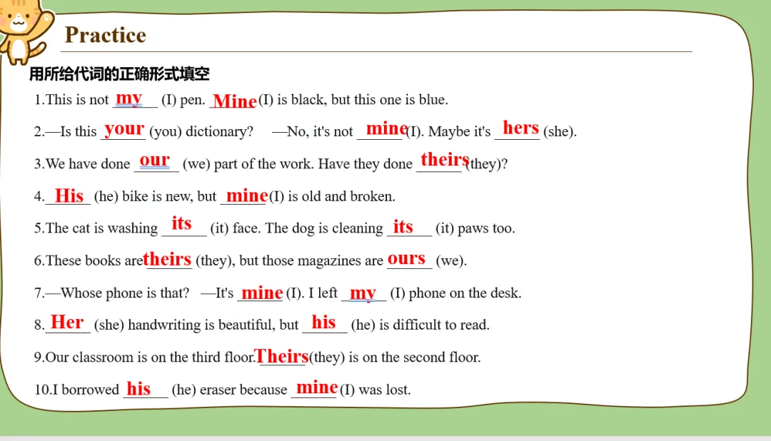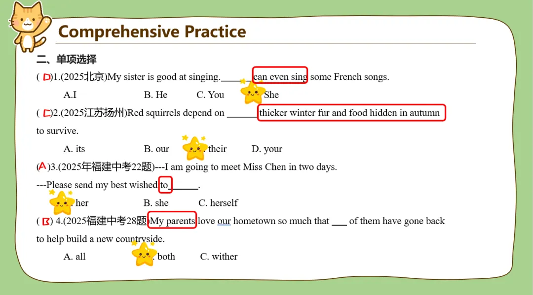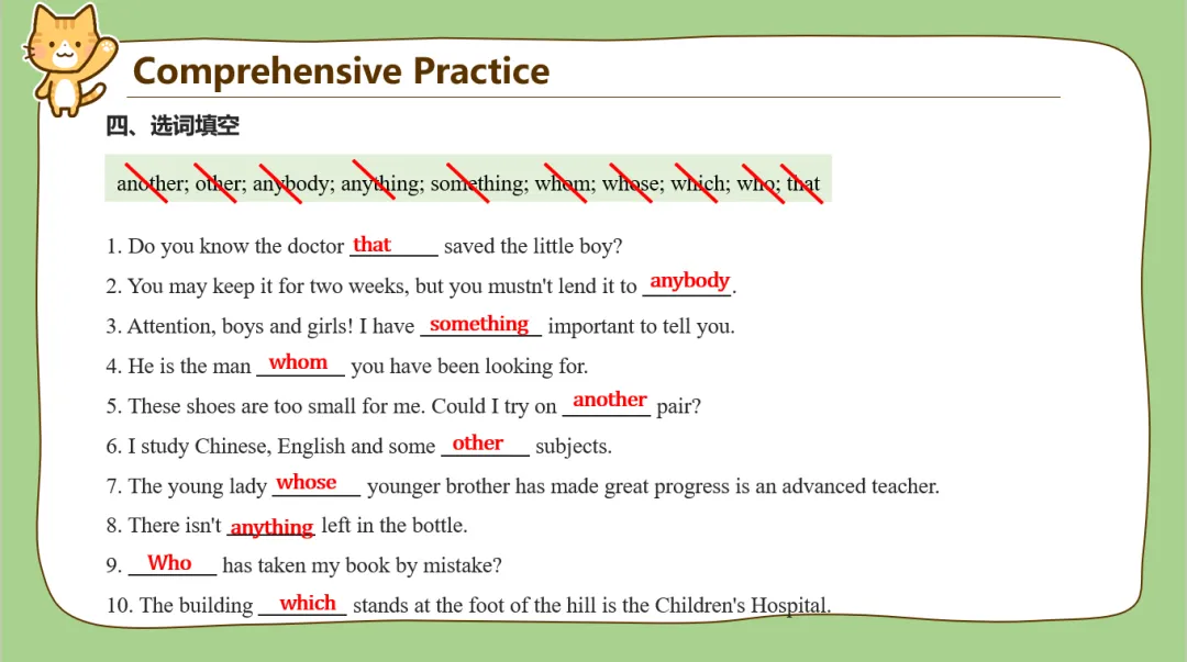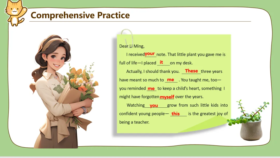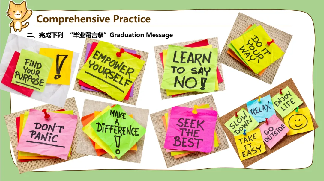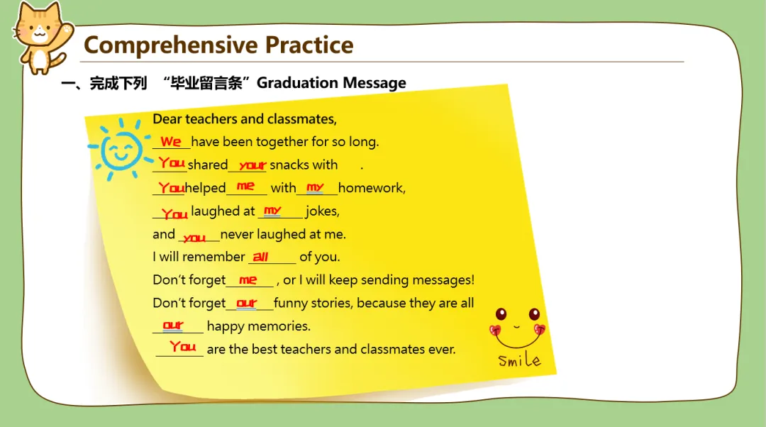 7类代词讲完之后又安排了点课后练习!我不知道为啥,我课件做到这里就突然想到了我上学时各个时期的毕业季,那些分别的同学和老师。于是课后练习设计了“毕业留言”形式。