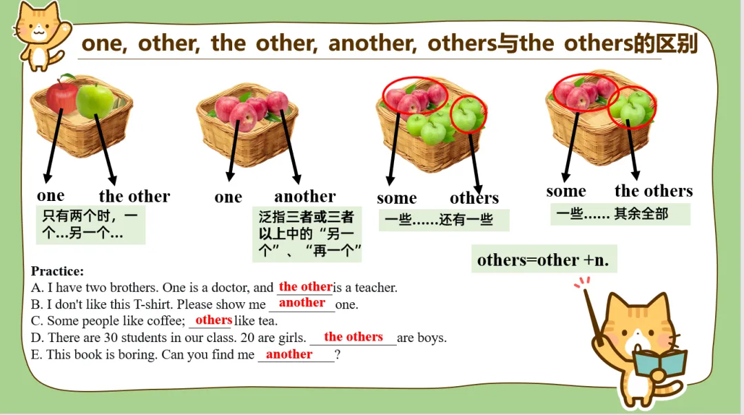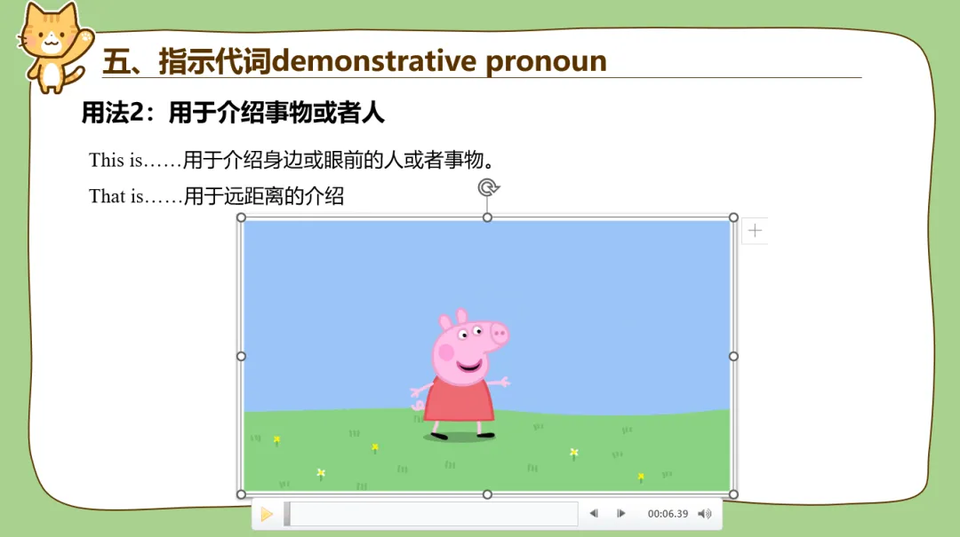 不定代词的展示我真的很想用非常形象的表示,我平时讲课过程中就是画一个长方形里面几何图形,要么就是口诀记忆。河南这边从2020年开始就不考单选了,要不然代词中的不定代词尤其是another, the other, others, the others, one,other还真的是易错点。很多学生你提问时都是一朵朵乌云从眼前飘过。this, that这里我还突然想到了《小猪佩奇》英文版的刚开头的介绍,我就直接插入视频了!