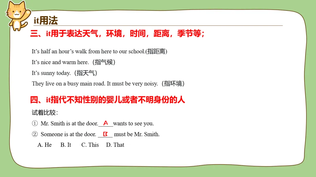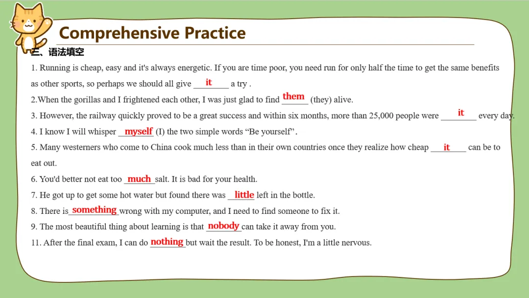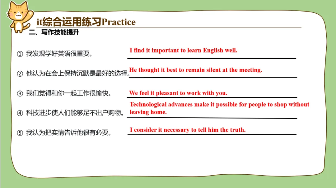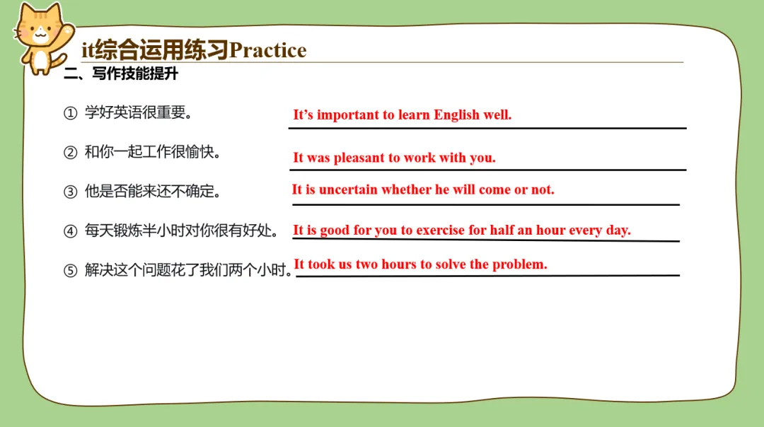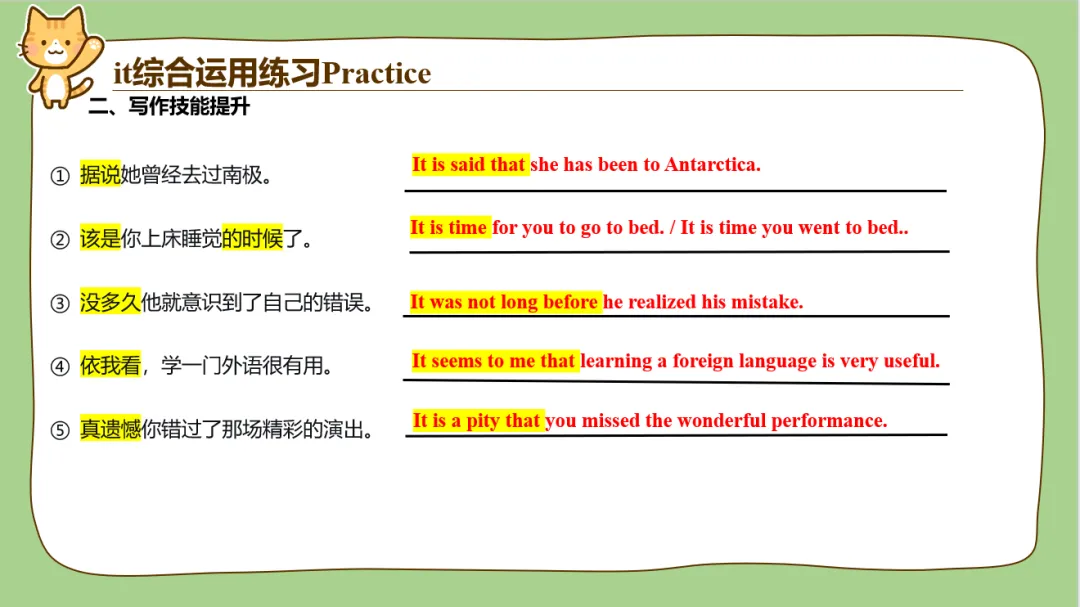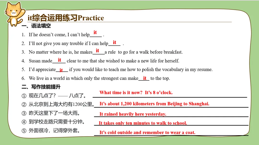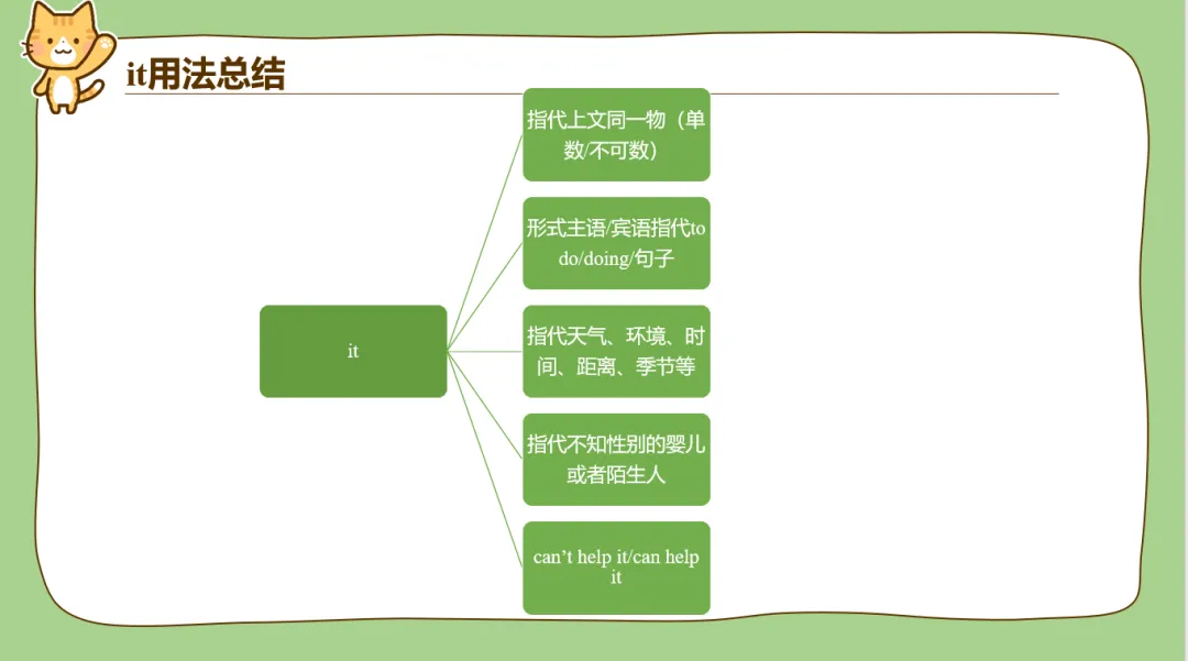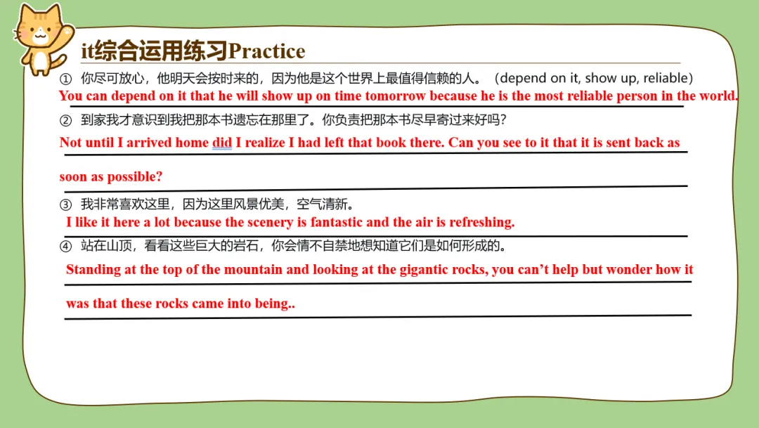 另外it的用法也很多,平时在教学过程中带it的句子有很多学生理解着也经常是迷迷糊糊的,比如说make it clear that; appreciate it if等这种句型,学生不能完全理解时经常会把it翻译出来,发现句子很不通顺。所以it我作为单独一个词进行了讲解,给了it最高的“礼遇”!另外后面配了很多汉译英翻译句子的练习,我平时给学生改作文的时候,看到有娃能用it形式主语或者形式宾语的句型都是眼睛一亮,忍不住给多打点分。所以为了让孩子们对it有更好的理解,我这里整了比较多的翻译练习。