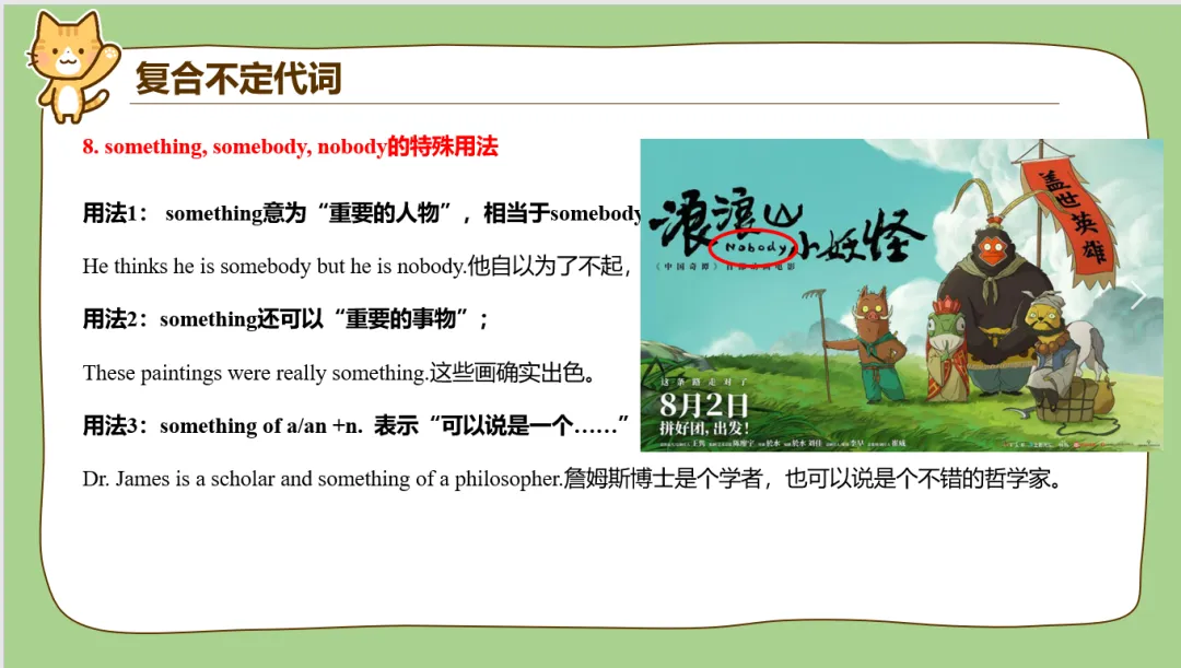 接下来就是复合不定代词的讲解了。这里特别想说一下,我当时看《浪浪山小妖怪》时,感觉这个英文名字起的真是妙啊!所以课件做到这里时我一下子就想到了这部电影的名字。
