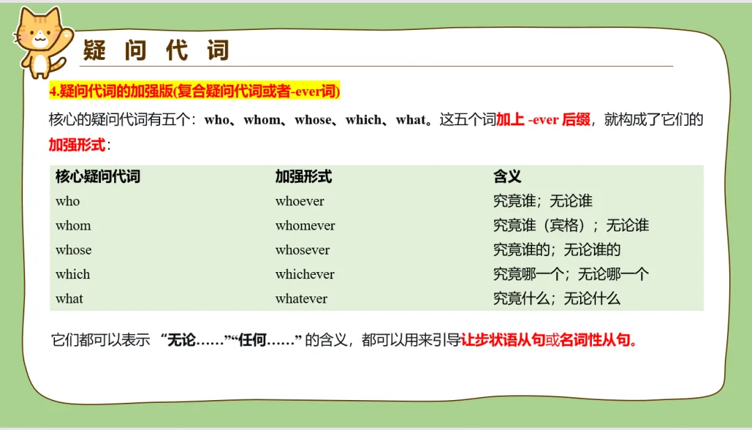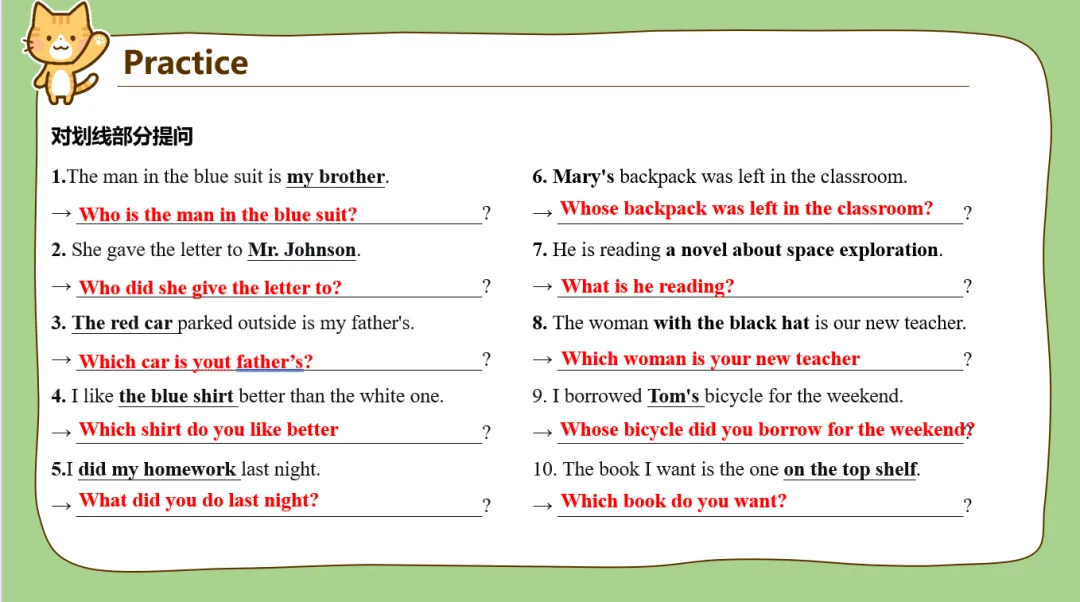 疑问代词小学和初中考的相对多一些,主要是涉及到句型转换,补全对话,读文章回答问题等。所以这里重点设计了句型转换。