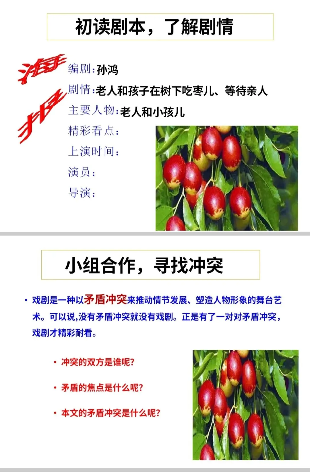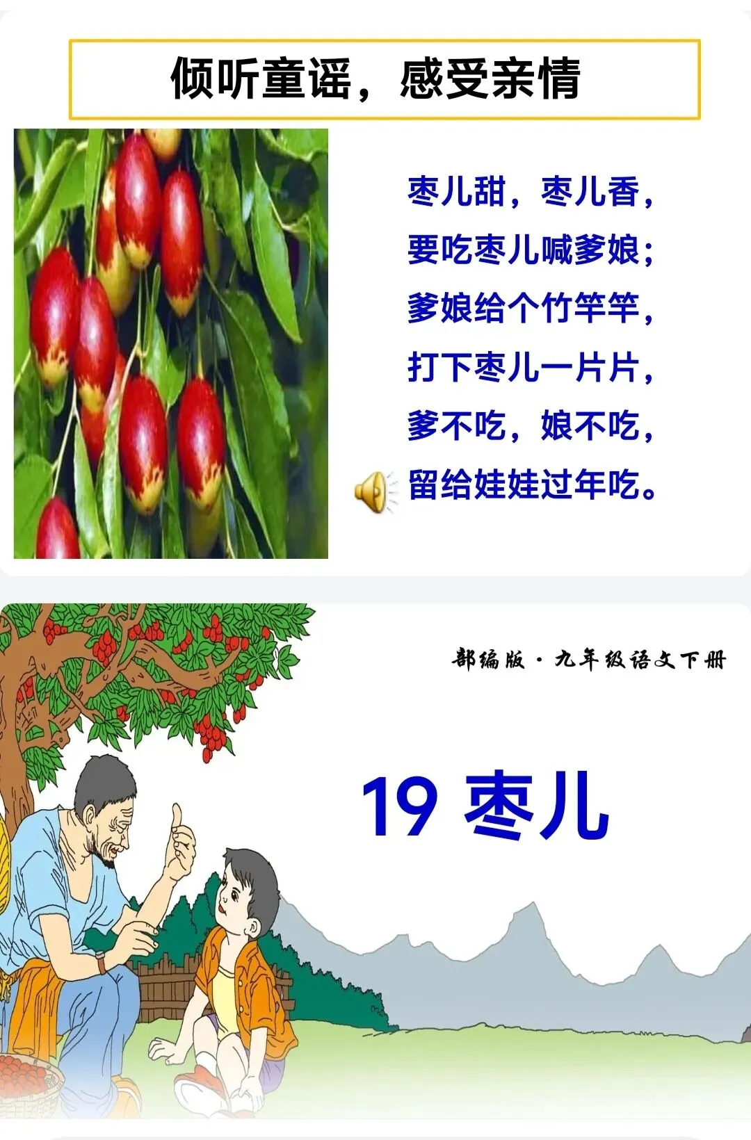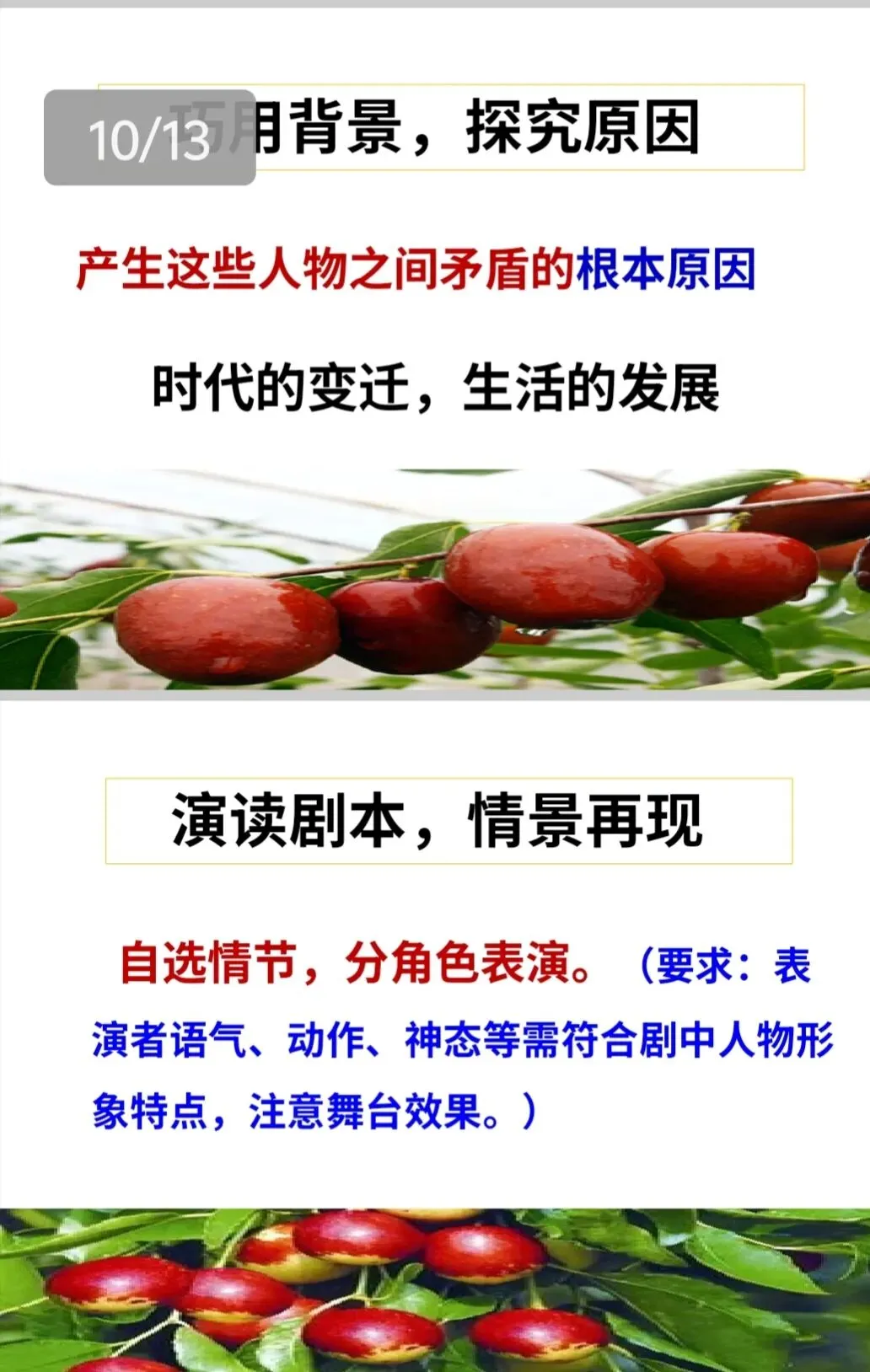 今年带初三,马上要学第五单元的戏剧了,翻出当年的课件,仿佛又回到了六年前《枣儿》的那节公开课。为了让孩子们更快走进乡土与乡愁,我特意请同事家的小朋友录了《枣儿》的童谣。甜甜的童声在课堂里响起时,仿佛连空气都裹着枣香,瞬间把大家拉回了那个满是牵挂的老枣树下。为了再现真实情境,有孩子拿来红彤彤的大枣,有同学找来柳树枝干,我和孩子们一起穿针引线,把一颗颗饱满的枣子串在枝头,挂在黑板旁。讲台不再是讲台,而是我们亲手搭建的“老枣树”,这是整堂课最温暖的舞台。后来的情景表演里,孩子们化身老人与男孩,在“枣树”下对望——一边是老人对儿子的漫长等待,藏着沉甸甸的乡愁;一边是男孩对父亲的热切期盼,裹着纯真的念想。传统与现代、故乡与远方,在这一刻轻轻碰撞,让每个人都读懂了“牵挂”的重量。课的最后,我们一起凝望“精神回乡”的画面,老人与孩子的身影叠在一起,像极了每一个在远方漂泊、却始终念着家的人。原来,那串挂在枝头的红枣,从来都不只是水果,而是我们心底对家、对亲人、对故土最柔软的眷恋。一晃多年,但每当想起《枣儿》,都会记得那串挂在枝头的红枣,和孩子们眼里一起发光的课堂。整理这份旧课件时,满是怀念与温暖。本想把那段甜美的童谣录音放进文中,可惜我对公众号编辑还不太熟悉,未能成功插入。愿大家在文字里,依然能听见那声温柔的童声,闻到老枣树下的清香。