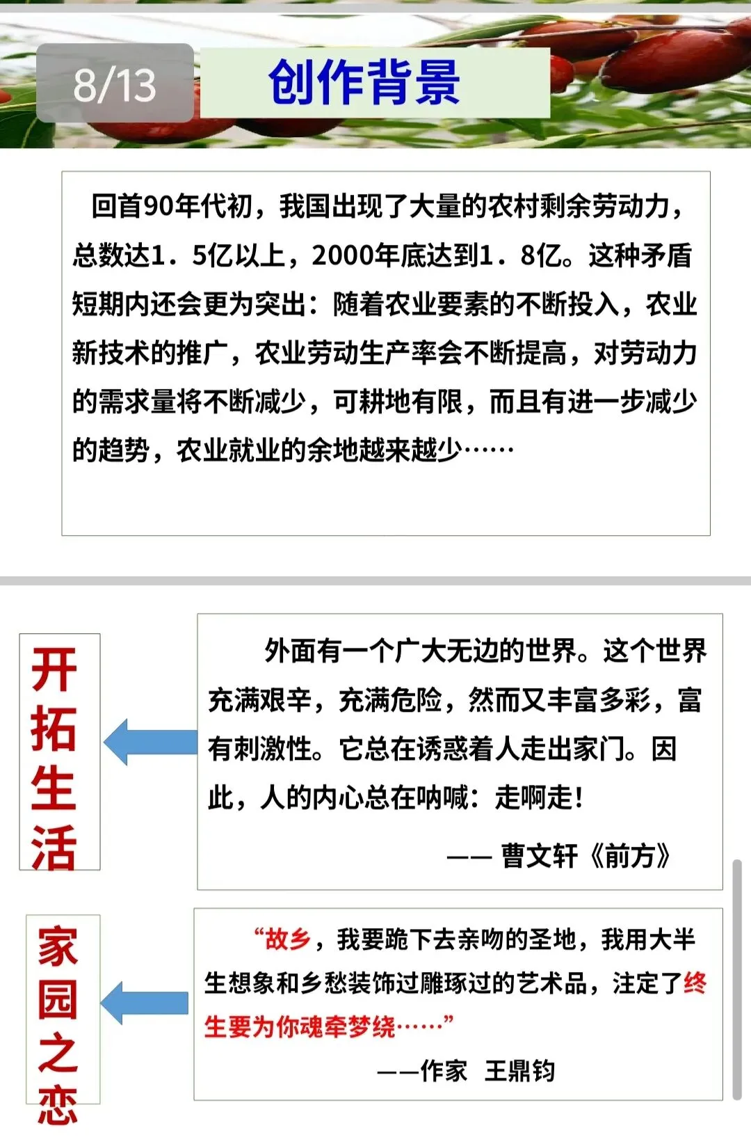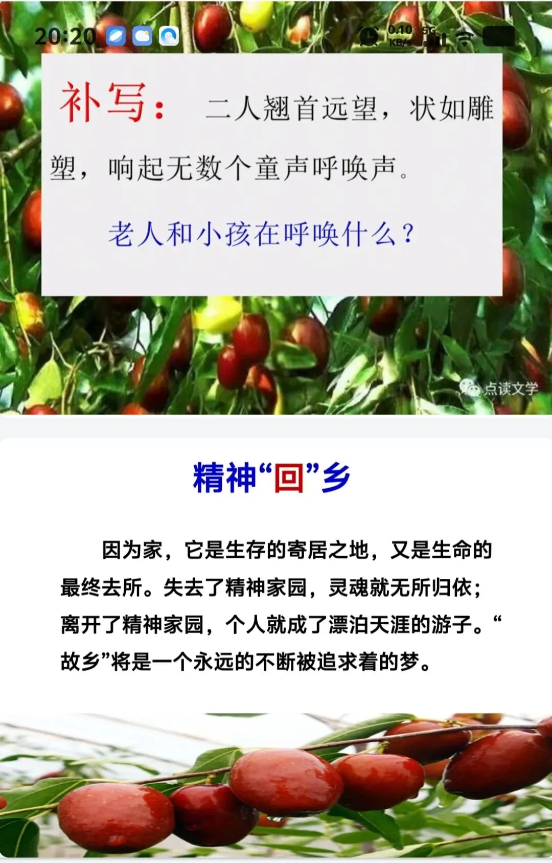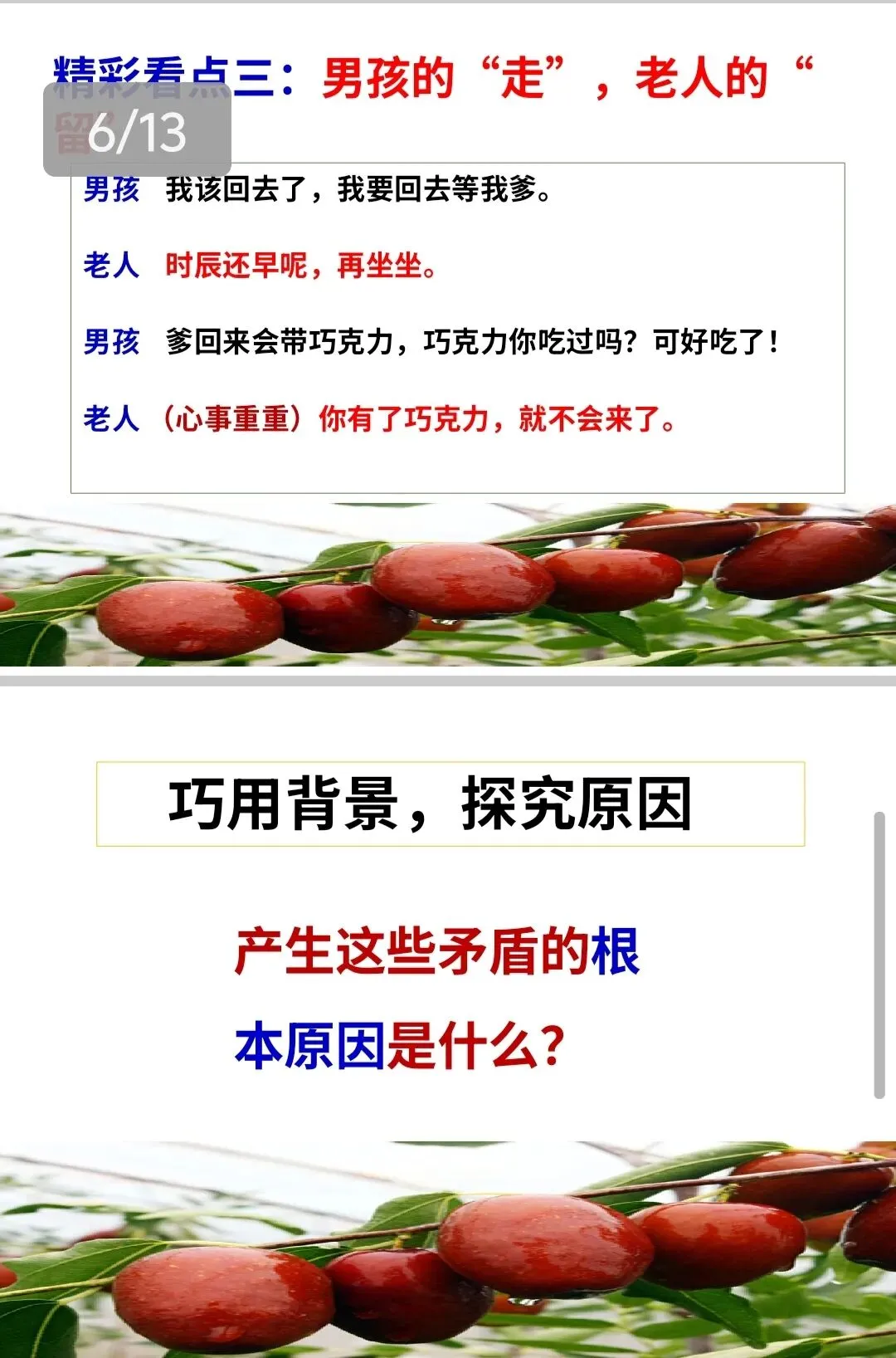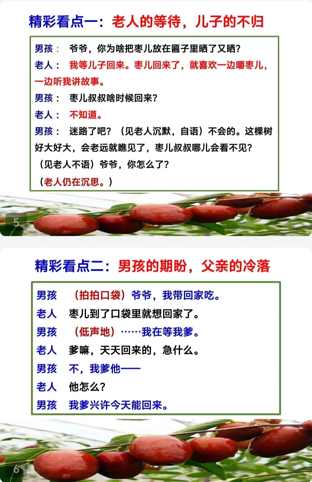 今年带初三,马上要学第五单元的戏剧了,翻出当年的课件,仿佛又回到了六年前《枣儿》的那节公开课。为了让孩子们更快走进乡土与乡愁,我特意请同事家的小朋友录了《枣儿》的童谣。甜甜的童声在课堂里响起时,仿佛连空气都裹着枣香,瞬间把大家拉回了那个满是牵挂的老枣树下。为了再现真实情境,有孩子拿来红彤彤的大枣,有同学找来柳树枝干,我和孩子们一起穿针引线,把一颗颗饱满的枣子串在枝头,挂在黑板旁。讲台不再是讲台,而是我们亲手搭建的“老枣树”,这是整堂课最温暖的舞台。后来的情景表演里,孩子们化身老人与男孩,在“枣树”下对望——一边是老人对儿子的漫长等待,藏着沉甸甸的乡愁;一边是男孩对父亲的热切期盼,裹着纯真的念想。传统与现代、故乡与远方,在这一刻轻轻碰撞,让每个人都读懂了“牵挂”的重量。课的最后,我们一起凝望“精神回乡”的画面,老人与孩子的身影叠在一起,像极了每一个在远方漂泊、却始终念着家的人。原来,那串挂在枝头的红枣,从来都不只是水果,而是我们心底对家、对亲人、对故土最柔软的眷恋。一晃多年,但每当想起《枣儿》,都会记得那串挂在枝头的红枣,和孩子们眼里一起发光的课堂。整理这份旧课件时,满是怀念与温暖。本想把那段甜美的童谣录音放进文中,可惜我对公众号编辑还不太熟悉,未能成功插入。愿大家在文字里,依然能听见那声温柔的童声,闻到老枣树下的清香。