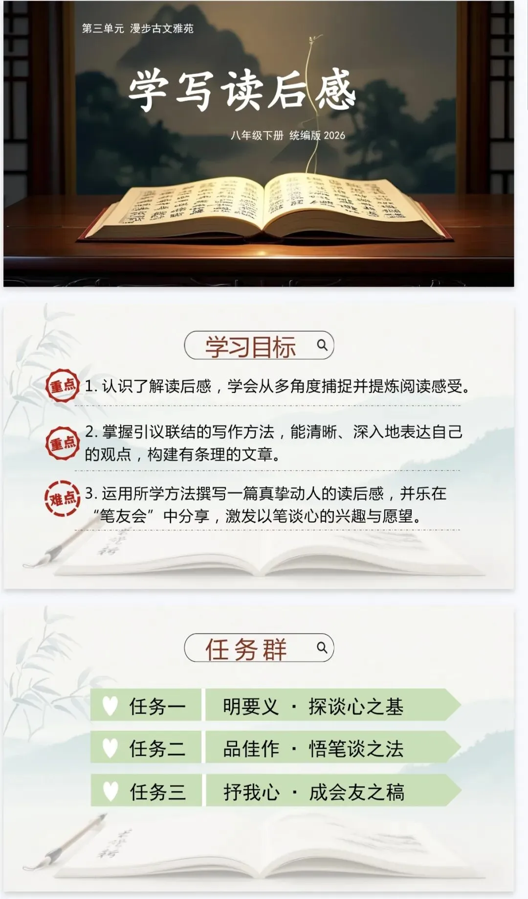 这份八年级下册第三单元《学写读后感》课件,把复杂写作拆解成3个清晰任务,课堂效率直接拉满!