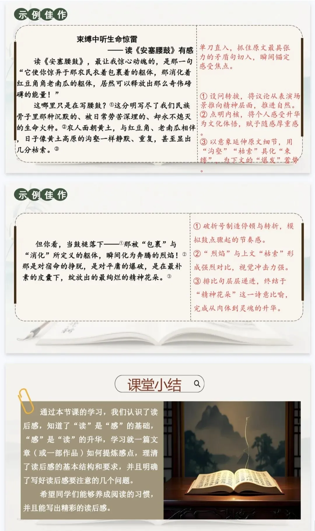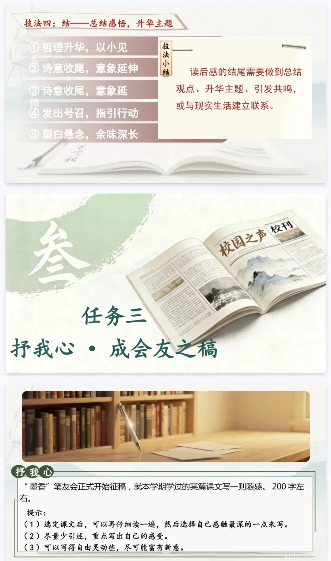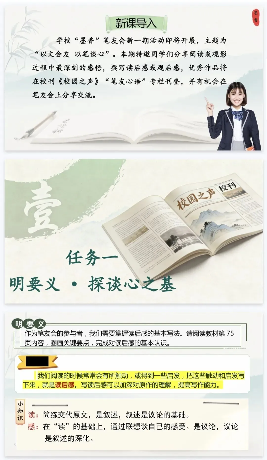 从“墨香笔友会”情境导入,让学生先懂读后感是什么、怎么选感受点,把“读”与“感”的逻辑讲透,打好写作基础。