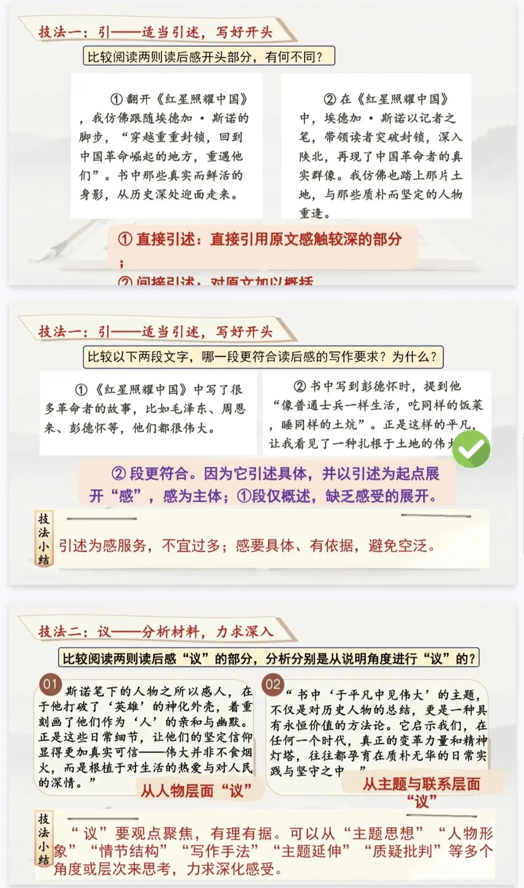 以《红星照耀中国》为例,拆解「引-议-联-结」四大技法,用对比阅读教学生怎么引述、怎么深入议论、怎么联系生活,模板化教学好上手。