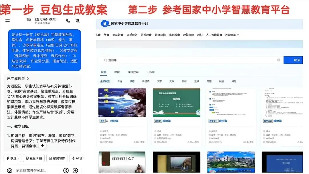 备课阶段,在豆包中输入教学需求,快速生成《观沧海》专属教案框架,同时结合国家中小学智慧教育平台的优质教学资源,对教案内容进行优化调整,适配班级学情,让备课从繁琐的资料整理中解放,大幅提升备课效率。