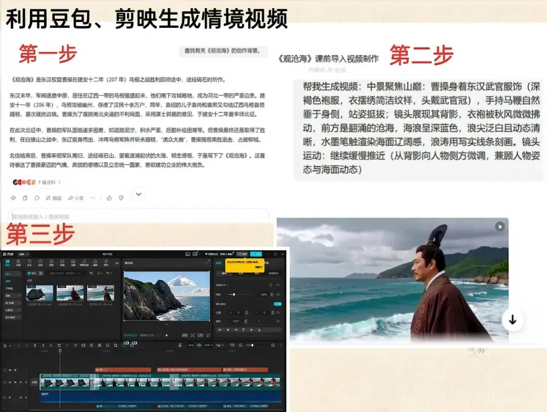 借助豆包生成的创作背景知识,快速掌握曹操北征乌桓、登临碣石的历史背景。在此基础上,运用豆包和剪映生成第一人称视角的导入语: