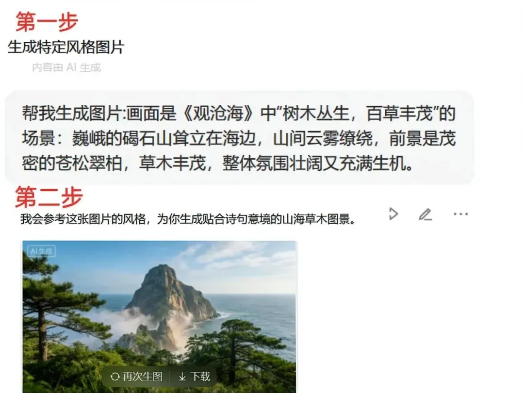 借助豆包生成与诗句匹配的图片素材,让学生结合画面说出对应的诗句。例如展示“ 树木丛生,百草丰茂 ”的画面,学生需准确匹配诗句并说明理由,既考察了对诗句的理解,又培养了图文转化的思辨能力。