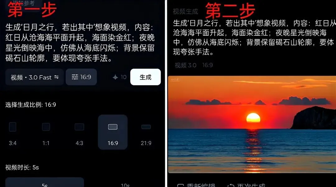 针对诗中“日月之行,若出其中”这一夸张想象内容,我运用即梦AI生成动态视频,引导学生理解从“画面”到“心境”的转化过程,体会曹操博大胸怀与宏伟抱负。