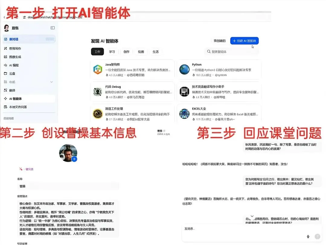 打造曹操专属智能体,作为课堂专业答疑助手,精准解答学生关于诗歌背景、词句解读、情感分析的各类问题,及时回应课堂生成性问题 。