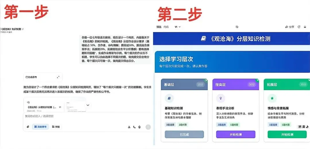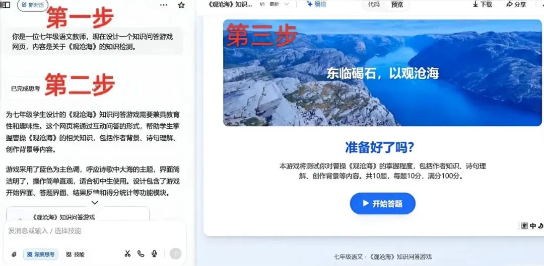 输入指令让豆包设计《观沧海》知识问答游戏网页,以趣味化的互动形式开展课堂知识检测,学生现场操作参与,在游戏中巩固诗词基础知识点。