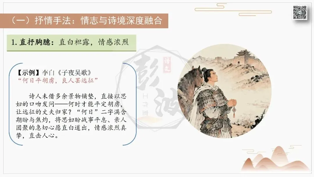 王维的"明月松间照,清泉石上流"(《山居秋暝》)绘出山水诗的空灵意境,王昌龄的 "黄沙百战穿金甲,不破楼兰终不还"(《从军行》)尽显边塞诗的慷慨悲壮。李商隐的 "春蚕到死丝方尽,蜡炬成灰泪始干"(《无题》)将爱情诗的缠绵悱恻推向极致,杜牧的 "商女不知亡国恨,隔江犹唱后庭花"(《泊秦淮》)则藏着咏史诗的深沉叹息。