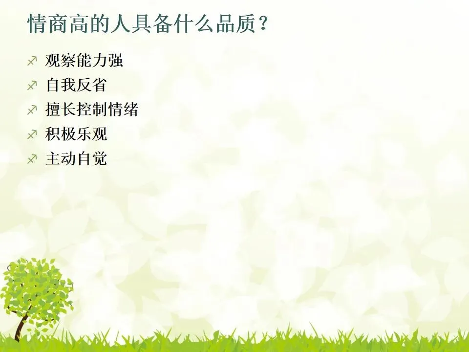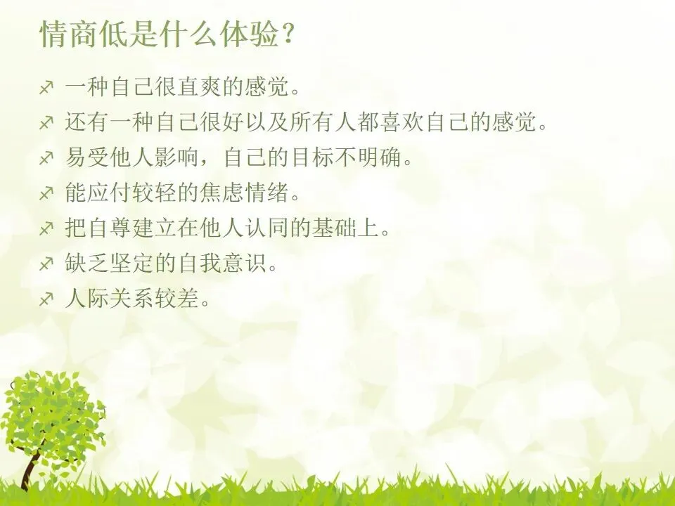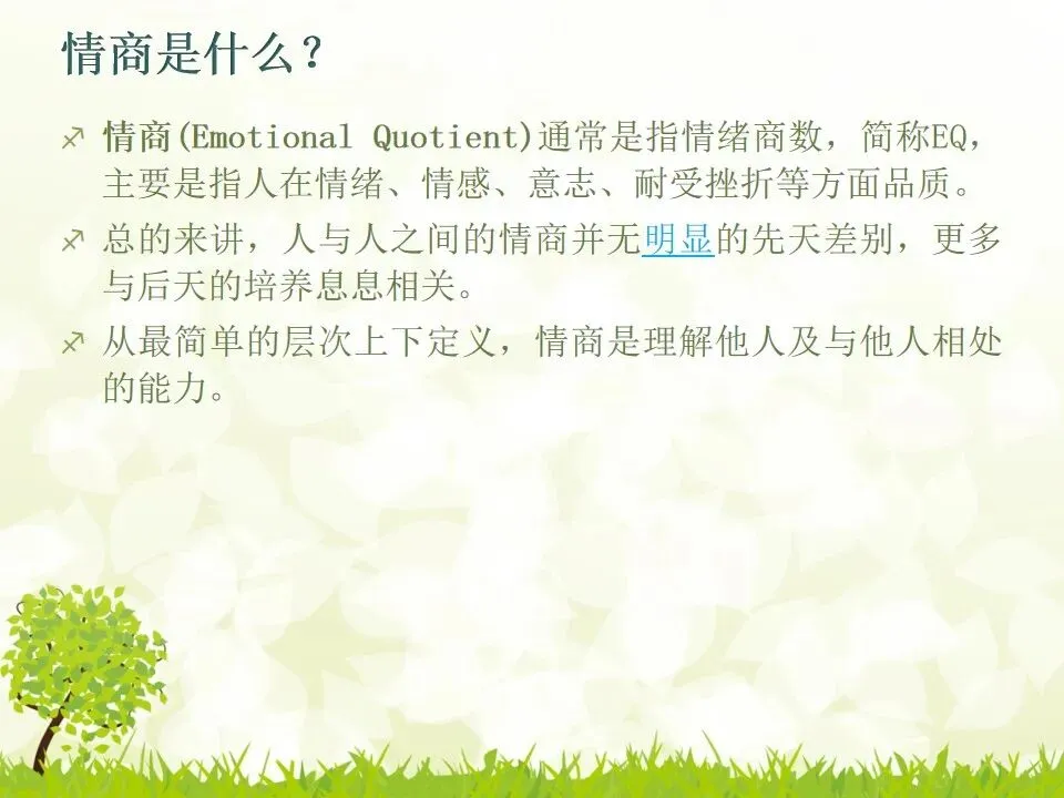 情商(Emotional Quotient)通常是指情绪商数,简称EQ,主要是指人在情绪、情感、意志、耐受挫折等方面品质。总的来讲,人与人之间的情商并无明显的先天差别,更多与后天的培养息息相关。从最简单的层次上下定义,情商是理解他人及与他人相处的能力。- 一种自己很直爽的感觉,还有一种自己很好以及所有人都喜欢自己的感觉;