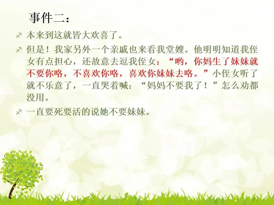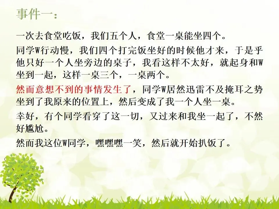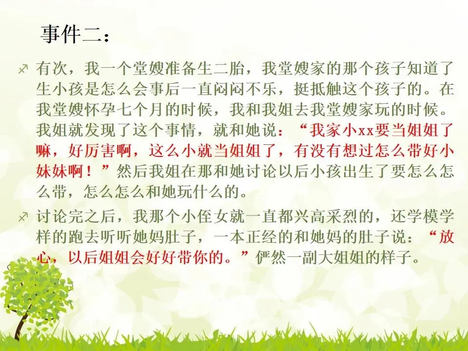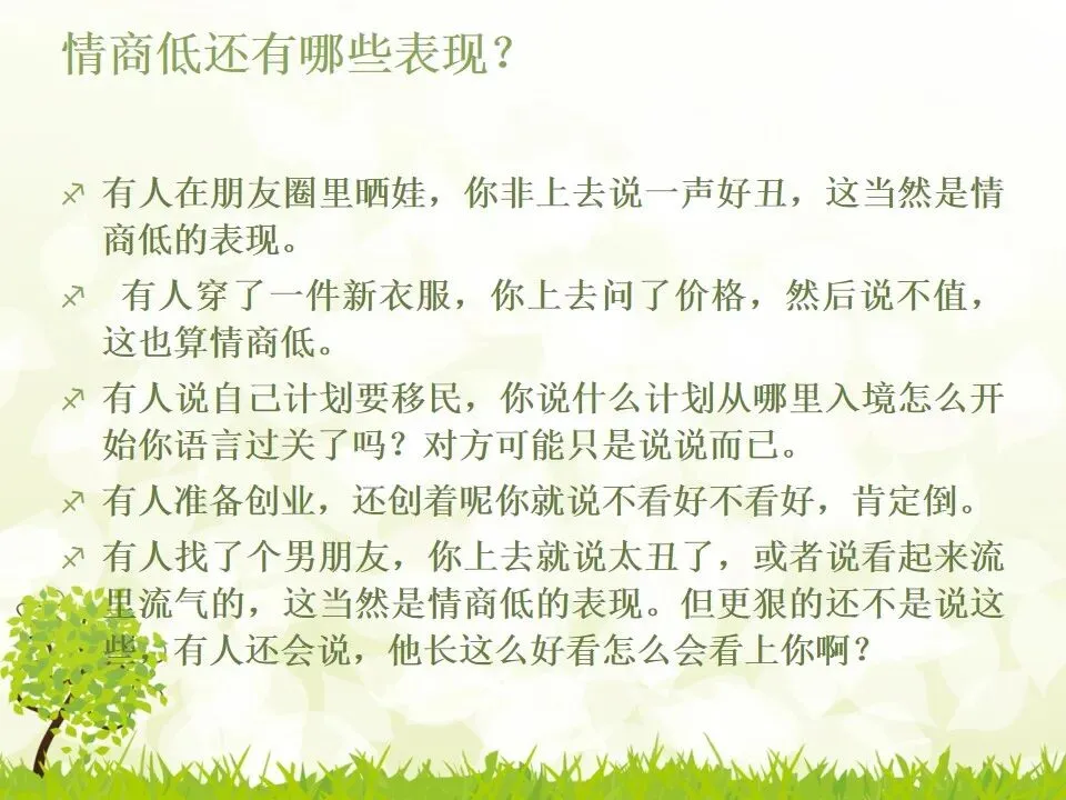 同学W行动慢,我们四个打完饭坐好的时候他才来,于是乎他只好一个人坐旁边的桌子,我看这样不太好,就起身和W坐到一起,这样一桌三个,一桌两个。然而意想不到的事情发生了,同学W居然迅雷不及掩耳之势坐到了我原来的位置上,然后变成了我一个人坐一桌。幸好,有个同学看穿了这一切,又过来和我坐一起了,不然好尴尬。有次,我一个堂嫂准备生二胎,我堂嫂家的那个孩子知道了生小孩是怎么会事后一直闷闷不乐,挺抵触这个孩子的。在我堂嫂怀孕七个月的时候,我和我姐去我堂嫂家玩的时候。我姐就发现了这个事情,就和她说:“我家小xx要当姐姐了嘛,好厉害啊,这么小就当姐姐了,有没有想过怎么带好小妹妹啊!”然后我姐在那和她讨论以后小孩出生了要怎么怎么带,怎么怎么和她玩什么的。讨论完之后,我那个小侄女就一直都兴高采烈的,还学模学样的跑去听听她妈肚子,一本正经的和她妈的肚子说:“放心,以后姐姐会好好带你的。”俨然一副大姐姐的样子。本来到这就皆大欢喜了。但是!我家另外一个亲戚也来看我堂嫂。他明明知道我侄女有点担心,还故意去逗我侄女:“哟,你妈生了妹妹就不要你咯,不喜欢你咯,喜欢你妹妹去咯。”小侄女听了就不乐意了,一直哭着喊:“妈妈不要我了!”怎么劝都没用。一直要死要活的说她不要妹妹。- 有人在朋友圈里晒娃,你非上去说一声好丑,这当然是情商低的表现。