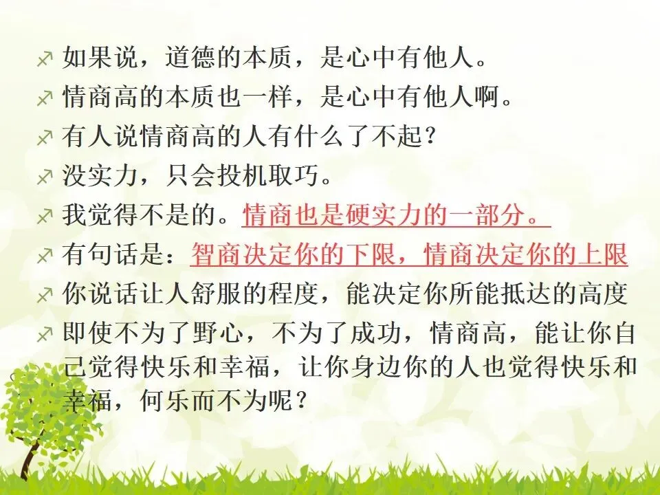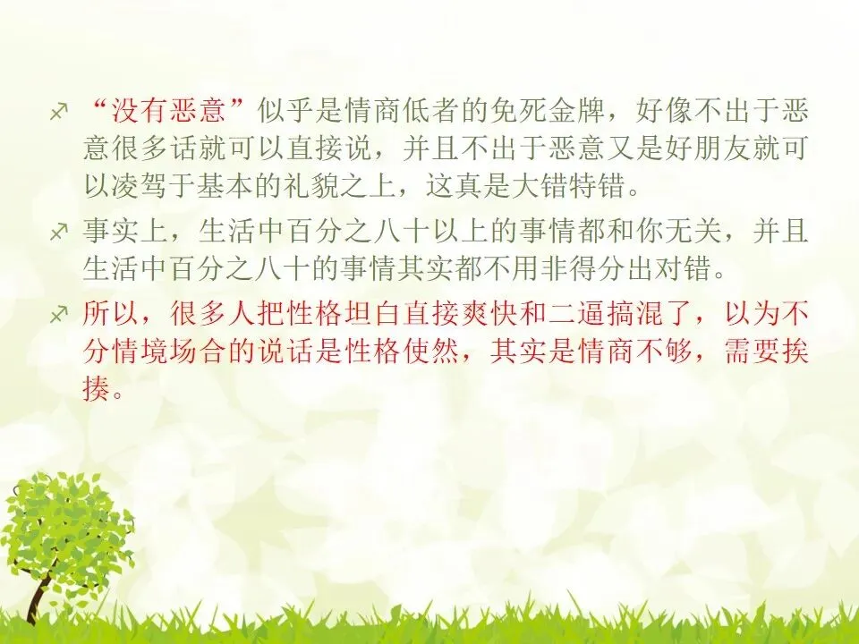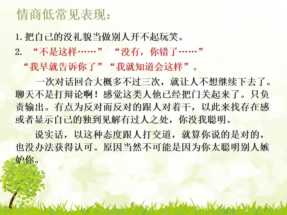 一次对话回合大概多不过三次,就让人不想继续下去了。聊天不是打辩论啊!感觉这类人他已经把门关起来了。只负责输出。有点为反对而反对的跟人对着干,以此来找存在感或者显示自己的独到见解有过人之处,你没我聪明。说实话,以这种态度跟人打交道,就算你说的是对的,也没办法获得认可。原因当然不可能是因为你太聪明别人嫉妒你。“没有恶意”似乎是情商低者的免死金牌,好像不出于恶意很多话就可以直接说,并且不出于恶意又是好朋友就可以凌驾于基本的礼貌之上,这真是大错特错。事实上,生活中百分之八十以上的事情都和你无关,并且生活中百分之八十的事情其实都不用非得分出对错。所以,很多人把性格坦白直接爽快和二逼搞混了,以为不分情境场合的说话是性格使然,其实是情商不够,需要挨揍。- 即使不为了野心,不为了成功,情商高,能让你自己觉得快乐和幸福,让你身边你的人也觉得快乐和幸福,何乐而不为呢?