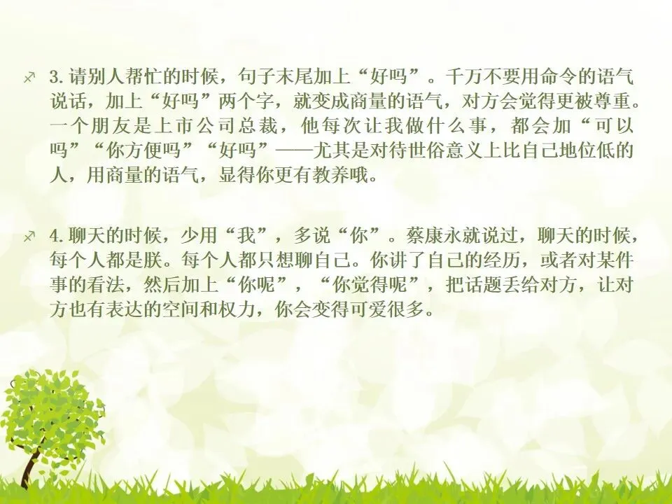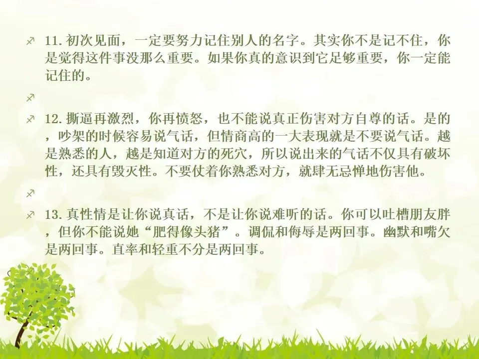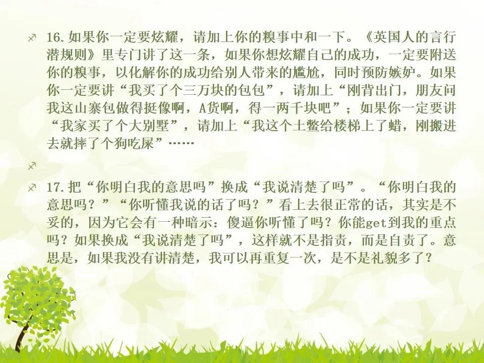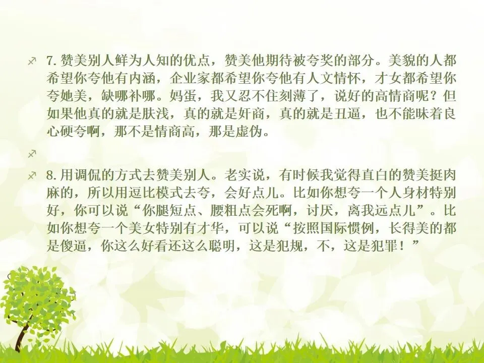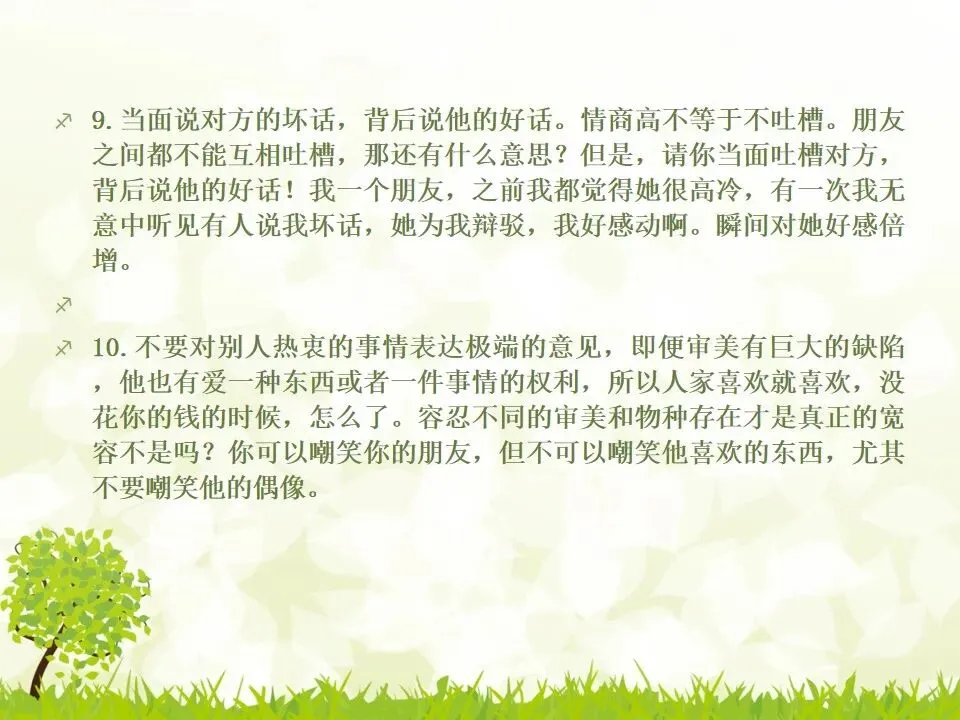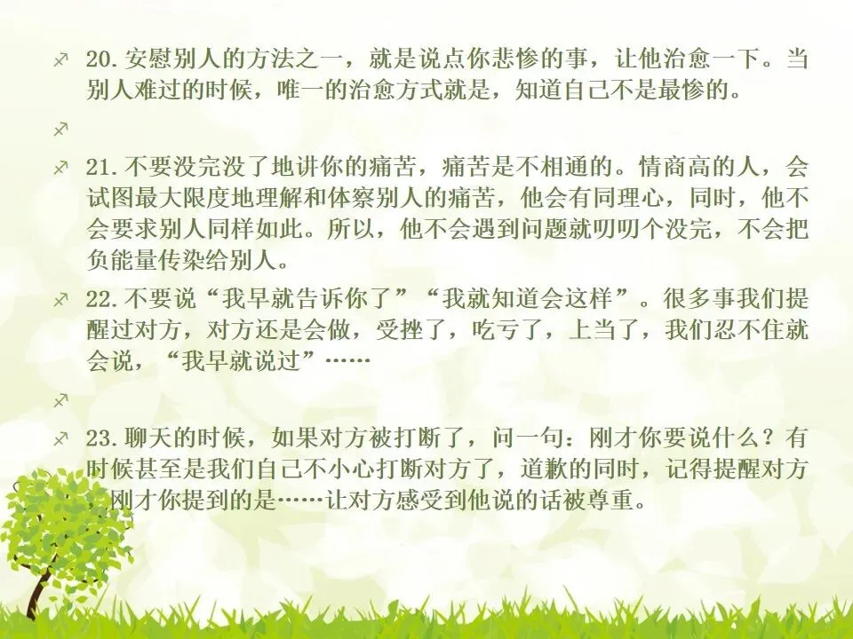 1.把你说的“不对”统统改成“对”。我有个朋友最喜欢说“不”,不管别人说什么,他先说“不”,“不对”,”不是的”,但他接下来的话并不是推翻别人,只是补充而已。他只是习惯了说“不”,大家都讨厌他。谁喜欢被否定啊?一个学识特别渊博的教授,有个美好的小习惯,不管对方说了多么傻逼的话,他一定会很诚恳地说,“对”,认真地指出你这个话可以成立的点,然后延展开去,讲他的看法。他这么牛逼的人,肯定了傻逼的你,你一定受宠若惊。而他把你的意见上升到那么牛逼的高度,你发现自己和他都好厉害哦。从此我学会了这一点,先肯定对方,再讲自己的意见,沟通氛围会好很多哦。2.说“谢谢”的时候可以加上“你”,或者加上对方的名字。“谢谢”和“谢谢你”的差别在哪?“谢谢”是泛指,而“谢谢你”是特指,更走心。对于陌生人,你说“谢谢你”,对于认识的人,加上对方的名字,会友善很多。很多。很多3.请别人帮忙的时候,句子末尾加上“好吗”。千万不要用命令的语气说话,加上“好吗”两个字,就变成商量的语气,对方会觉得更被尊重。一个朋友是上市公司总裁,他每次让我做什么事,都会加“可以吗”“你方便吗”“好吗”——尤其是对待世俗意义上比自己地位低的人,用商量的语气,显得你更有教养哦。4.聊天的时候,少用“我”,多说“你”。蔡康永就说过,聊天的时候,每个人都是朕。每个人都只想聊自己。你讲了自己的经历,或者对某件事的看法,然后加上“你呢”,“你觉得呢”,把话题丢给对方,让对方也有表达的空间和权力,你会变得可爱很多。5.多用“我们”、“咱们”,可以迅速拉近关系。比如跟刚认识的人约见面,比起问“明天在哪儿见面啊”,换成“明天咱们在哪儿见面啊”,只是一个细节的改动,就显得更亲切了,对吧。6.赞美别人的时候,不要太空泛,要具体地赞美细节。“ 你好美啊”、“你好聪明”、“你好牛逼”这些是普通级的赞美,更高级的赞美是,找到对方怎么美、怎么聪明、怎么牛逼。比如夸一个人文笔好,对方会当成一种客套,但是如果说哪篇文章写得特别好,哪段话他特别喜欢,对方会特别感动。7.赞美别人鲜为人知的优点,赞美他期待被夸奖的部分。美貌的人都希望你夸他有内涵,企业家都希望你夸他有人文情怀,才女都希望你夸她美,缺哪补哪。妈蛋,我又忍不住刻薄了,说好的高情商呢?但如果他真的就是肤浅,真的就是奸商,真的就是丑逼,也不能昧着良心硬夸啊,那不是情商高,那是虚伪。8.用调侃的方式去赞美别人。老实说,有时候我觉得直白的赞美挺肉麻的,所以用逗比模式去夸,会好点儿。比如你想夸一个人身材特别好,你可以说“你腿短点、腰粗点会死啊,讨厌,离我远点儿”。比如你想夸一个美女特别有才华,可以说“按照国际惯例,长得美的都是傻逼,你这么好看还这么聪明,这是犯规,不,这是犯罪!”9.当面说对方的坏话,背后说他的好话。情商高不等于不吐槽。朋友之间都不能互相吐槽,那还有什么意思?但是,请你当面吐槽对方,背后说他的好话!我一个朋友,之前我都觉得她很高冷,有一次我无意中听见有人说我坏话,她为我辩驳,我好感动啊。瞬间对她好感倍增。10.不要对别人热衷的事情表达极端的意见,即便审美有巨大的缺陷,他也有爱一种东西或者一件事情的权利,所以人家喜欢就喜欢,没花你的钱的时候,怎么了。容忍不同的审美和物种存在才是真正的宽容不是吗?你可以嘲笑你的朋友,但不可以嘲笑他喜欢的东西,尤其不要嘲笑他的偶像。11.初次见面,一定要努力记住别人的名字。其实你不是记不住,你是觉得这件事没那么重要。如果你真的意识到它足够重要,你一定能记住的。12.撕逼再激烈,你再愤怒,也不能说真正伤害对方自尊的话。是的,吵架的时候容易说气话,但情商高的一大表现就是不要说气话。越是熟悉的人,越是知道对方的死穴,所以说出来的气话不仅具有破坏性,还具有毁灭性。不要仗着你熟悉对方,就肆无忌惮地伤害他。13.真性情是让你说真话,不是让你说难听的话。你可以吐槽朋友胖,但你不能说她“肥得像头猪”。调侃和侮辱是两回事。幽默和嘴欠是两回事。直率和轻重不分是两回事。14.看破,但不点破,给别人留一点余地。发现对方说错话或者说谎,不要当面拆穿。别人背了山寨包来炫耀,没有必要当面戳破。其实,买假包已经很辛酸了,买了假包还要当真包炫耀,更辛酸了。一个人不够强大的时候,才试图用名牌来证明自己,等她变得强大一些,有自信了,就会懂了。15.社交场合中,要考虑少数派的感受。如果一场聚会,你们有10人,哪怕9个人都是老乡,你们最好都不要讲方言,尤其是你们的方言别人听不懂的时候,另外一个人会非常尴尬。如果你们有10个人,哪怕9个都是同事或同学,另一个不是,你们都不要只讲你们公司或者你们班上的事,另一个人会很非常孤单。照顾一下少数派,讲一些他也能参与的话题,让他不要被隔离掉。16.如果你一定要炫耀,请加上你的糗事中和一下。《英国人的言行潜规则》里专门讲了这一条,如果你想炫耀自己的成功,一定要附送你的糗事,以化解你的成功给别人带来的尴尬,同时预防嫉妒。如果你一定要讲“我买了个三万块的包包”,请加上“刚背出门,朋友问我这山寨包做得挺像啊,A货啊,得一两千块吧”;如果你一定要讲“我家买了个大别墅”,请加上“我这个土鳖给楼梯上