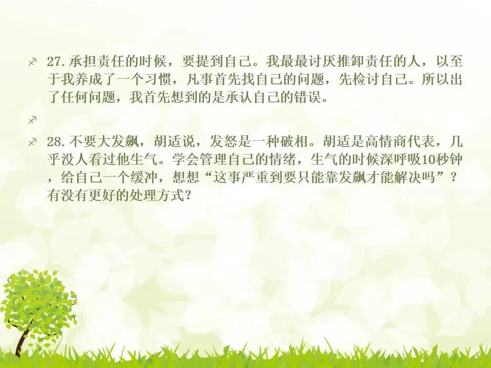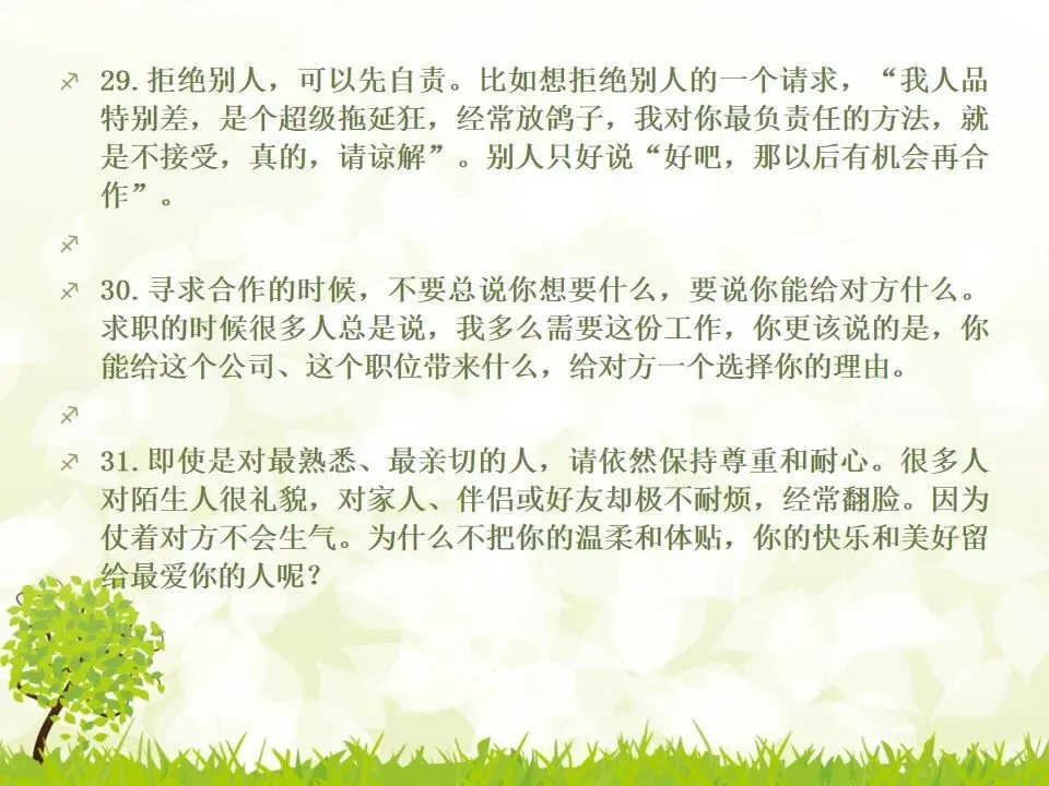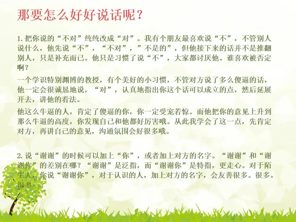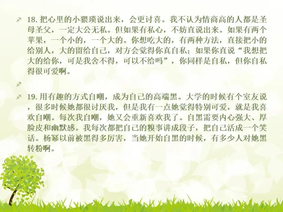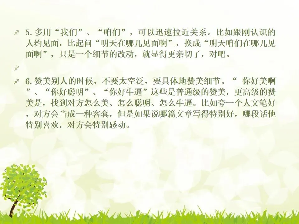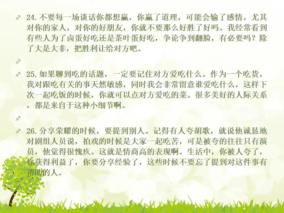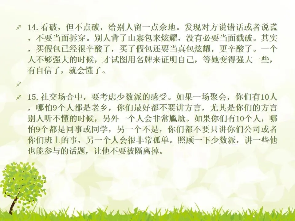 1.把你说的“不对”统统改成“对”。我有个朋友最喜欢说“不”,不管别人说什么,他先说“不”,“不对”,”不是的”,但他接下来的话并不是推翻别人,只是补充而已。他只是习惯了说“不”,大家都讨厌他。谁喜欢被否定啊?一个学识特别渊博的教授,有个美好的小习惯,不管对方说了多么傻逼的话,他一定会很诚恳地说,“对”,认真地指出你这个话可以成立的点,然后延展开去,讲他的看法。他这么牛逼的人,肯定了傻逼的你,你一定受宠若惊。而他把你的意见上升到那么牛逼的高度,你发现自己和他都好厉害哦。从此我学会了这一点,先肯定对方,再讲自己的意见,沟通氛围会好很多哦。2.说“谢谢”的时候可以加上“你”,或者加上对方的名字。“谢谢”和“谢谢你”的差别在哪?“谢谢”是泛指,而“谢谢你”是特指,更走心。对于陌生人,你说“谢谢你”,对于认识的人,加上对方的名字,会友善很多。很多。很多3.请别人帮忙的时候,句子末尾加上“好吗”。千万不要用命令的语气说话,加上“好吗”两个字,就变成商量的语气,对方会觉得更被尊重。一个朋友是上市公司总裁,他每次让我做什么事,都会加“可以吗”“你方便吗”“好吗”——尤其是对待世俗意义上比自己地位低的人,用商量的语气,显得你更有教养哦。4.聊天的时候,少用“我”,多说“你”。蔡康永就说过,聊天的时候,每个人都是朕。每个人都只想聊自己。你讲了自己的经历,或者对某件事的看法,然后加上“你呢”,“你觉得呢”,把话题丢给对方,让对方也有表达的空间和权力,你会变得可爱很多。5.多用“我们”、“咱们”,可以迅速拉近关系。比如跟刚认识的人约见面,比起问“明天在哪儿见面啊”,换成“明天咱们在哪儿见面啊”,只是一个细节的改动,就显得更亲切了,对吧。6.赞美别人的时候,不要太空泛,要具体地赞美细节。“ 你好美啊”、“你好聪明”、“你好牛逼”这些是普通级的赞美,更高级的赞美是,找到对方怎么美、怎么聪明、怎么牛逼。比如夸一个人文笔好,对方会当成一种客套,但是如果说哪篇文章写得特别好,哪段话他特别喜欢,对方会特别感动。7.赞美别人鲜为人知的优点,赞美他期待被夸奖的部分。美貌的人都希望你夸他有内涵,企业家都希望你夸他有人文情怀,才女都希望你夸她美,缺哪补哪。妈蛋,我又忍不住刻薄了,说好的高情商呢?但如果他真的就是肤浅,真的就是奸商,真的就是丑逼,也不能昧着良心硬夸啊,那不是情商高,那是虚伪。8.用调侃的方式去赞美别人。老实说,有时候我觉得直白的赞美挺肉麻的,所以用逗比模式去夸,会好点儿。比如你想夸一个人身材特别好,你可以说“你腿短点、腰粗点会死啊,讨厌,离我远点儿”。比如你想夸一个美女特别有才华,可以说“按照国际惯例,长得美的都是傻逼,你这么好看还这么聪明,这是犯规,不,这是犯罪!”9.当面说对方的坏话,背后说他的好话。情商高不等于不吐槽。朋友之间都不能互相吐槽,那还有什么意思?但是,请你当面吐槽对方,背后说他的好话!我一个朋友,之前我都觉得她很高冷,有一次我无意中听见有人说我坏话,她为我辩驳,我好感动啊。瞬间对她好感倍增。10.不要对别人热衷的事情表达极端的意见,即便审美有巨大的缺陷,他也有爱一种东西或者一件事情的权利,所以人家喜欢就喜欢,没花你的钱的时候,怎么了。容忍不同的审美和物种存在才是真正的宽容不是吗?你可以嘲笑你的朋友,但不可以嘲笑他喜欢的东西,尤其不要嘲笑他的偶像。11.初次见面,一定要努力记住别人的名字。其实你不是记不住,你是觉得这件事没那么重要。如果你真的意识到它足够重要,你一定能记住的。12.撕逼再激烈,你再愤怒,也不能说真正伤害对方自尊的话。是的,吵架的时候容易说气话,但情商高的一大表现就是不要说气话。越是熟悉的人,越是知道对方的死穴,所以说出来的气话不仅具有破坏性,还具有毁灭性。不要仗着你熟悉对方,就肆无忌惮地伤害他。13.真性情是让你说真话,不是让你说难听的话。你可以吐槽朋友胖,但你不能说她“肥得像头猪”。调侃和侮辱是两回事。幽默和嘴欠是两回事。直率和轻重不分是两回事。14.看破,但不点破,给别人留一点余地。发现对方说错话或者说谎,不要当面拆穿。别人背了山寨包来炫耀,没有必要当面戳破。其实,买假包已经很辛酸了,买了假包还要当真包炫耀,更辛酸了。一个人不够强大的时候,才试图用名牌来证明自己,等她变得强大一些,有自信了,就会懂了。15.社交场合中,要考虑少数派的感受。如果一场聚会,你们有10人,哪怕9个人都是老乡,你们最好都不要讲方言,尤其是你们的方言别人听不懂的时候,另外一个人会非常尴尬。如果你们有10个人,哪怕9个都是同事或同学,另一个不是,你们都不要只讲你们公司或者你们班上的事,另一个人会很非常孤单。照顾一下少数派,讲一些他也能参与的话题,让他不要被隔离掉。16.如果你一定要炫耀,请加上你的糗事中和一下。《英国人的言行潜规则》里专门讲了这一条,如果你想炫耀自己的成功,一定要附送你的糗事,以化解你的成功给别人带来的尴尬,同时预防嫉妒。如果你一定要讲“我买了个三万块的包包”,请加上“刚背出门,朋友问我这山寨包做得挺像啊,A货啊,得一两千块吧”;如果你一定要讲“我家买了个大别墅”,请加上“我这个土鳖给楼梯上