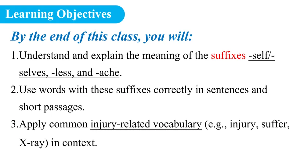 1. 师生共同回顾:三大后缀的含义及构词规则(-less=without;-ache=pain;-self/selves=某人/某物自己)。