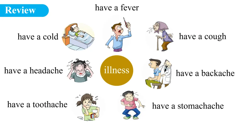 1. 快速问答+短语接龙:教师提问“What illness do you know?”,引导学生说出have a cold/fever/cough/headache/toothache等已学疾病短语,全班接龙巩固,自然衔接本课身体疼痛、构词法相关词汇。