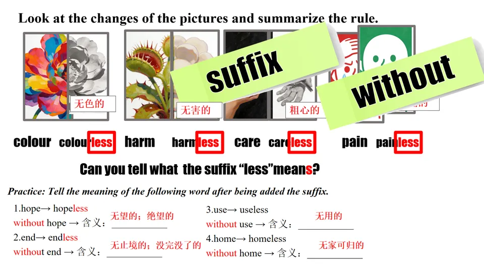- 展示词汇变化:colour→colourless、harm→harmless等,结合中文释义“无色的、无害的”,引导学生自主总结-less = without(没有)。