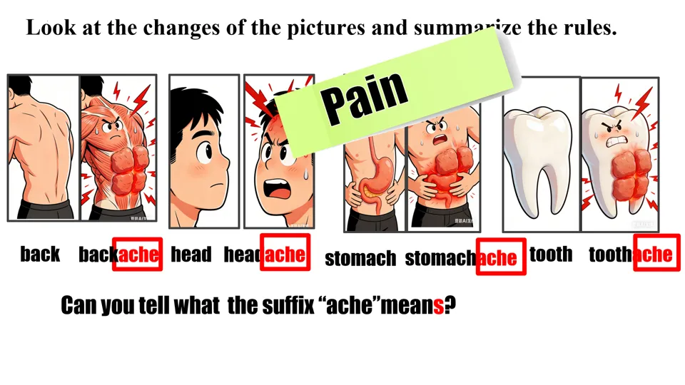 - 结合已学短语have a headache/toothache,展示back→backache、stomach→stomachache,引导学生总结**-ache = pain(疼痛)**,且多与身体部位搭配表“某部位痛”。