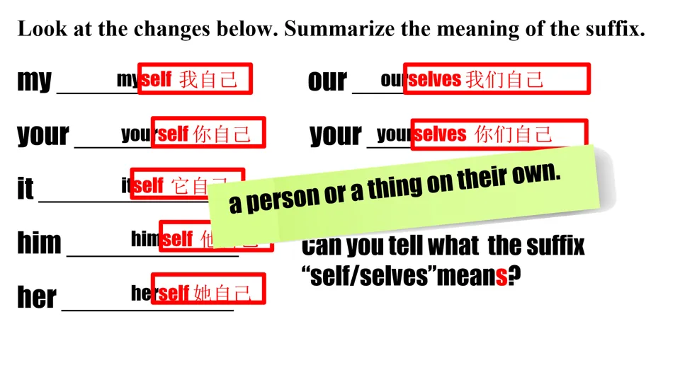 - 展示人称代词变反身代词:my→myself、our→ourselves等,让学生补全2a表格中的空缺,总结**-self/-selves = a person/thing on their own(某人/某物自己)**,区分单复数形式(self对应单数,selves对应复数)。