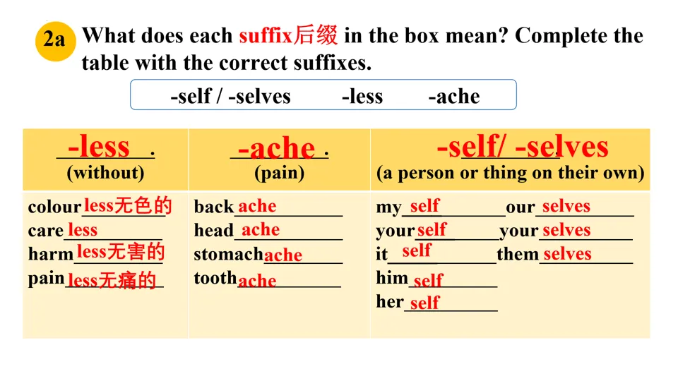 - 让学生独立填写2a表格,将三大后缀与含义、例词匹配,同桌互查后教师核对答案,领读所有构词例词,纠正发音。