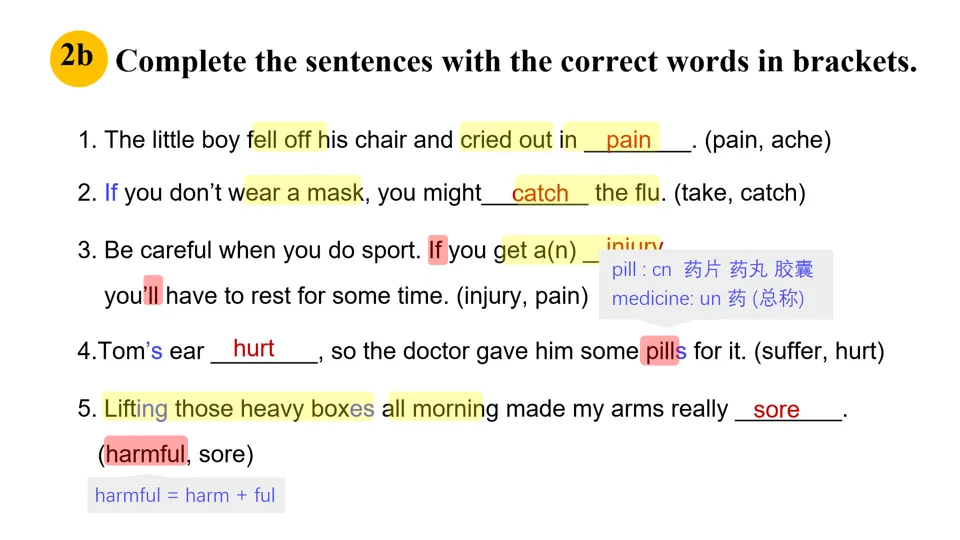 - 让学生独立完成2b,重点聚焦pain/ache、catch/take、injury/pain、suffer/hurt、harmful/sore五组易混词。