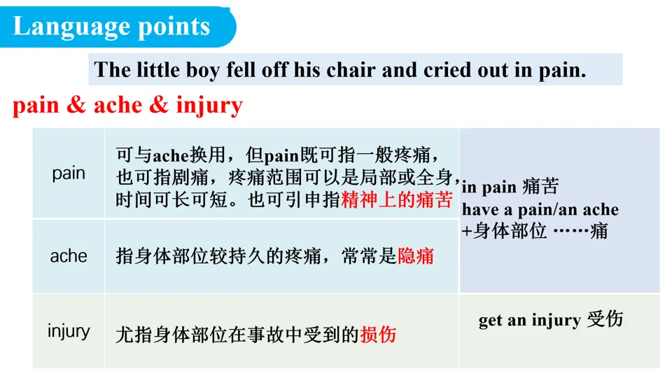 - 核对答案后,结合Language points板块,用表格清晰讲解pain/ache/injury的词义、用法区别,补充固定搭配:catch the flu(患流感)、get an injury(受伤)、sore + 身体部位(某部位酸痛)。