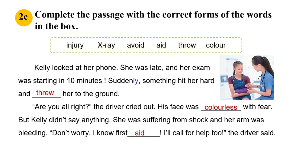 - 独立完成填空后,全班核对答案,重点讲解threw(throw过去式)、colourless、first aid、X-ray、avoid doing sth等核心表达,引导学生理解短文语境。