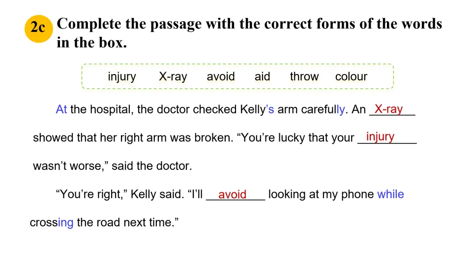 - 让学生通读2c短文,圈出方框内词汇(injury、X-ray等),分析词形变化要求(如动词时态、词性转换)。