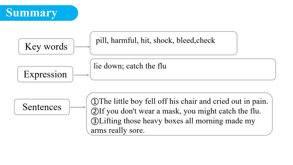 2. 梳理核心词汇&短语:pill、harmful、shock、bleed、catch the flu、get an injury、avoid doing sth等。