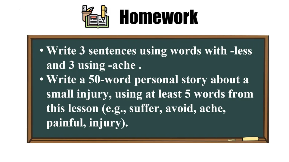 2. 提升作业:写一篇50词左右的个人小经历,主题为“一次小受伤”,至少运用本课5个词汇(如suffer、avoid、ache、injury等),锻炼词汇综合运用能力。