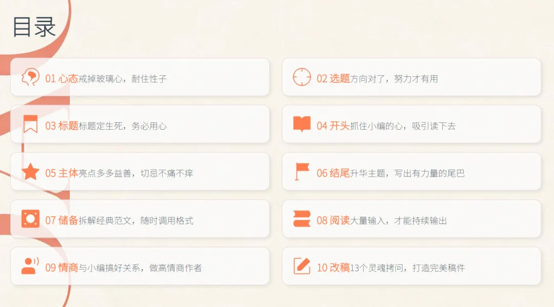 这次的课件升级,不是简单的内容修改,而是从头到尾的优化、完善,结合我这几年带学员的经验,结合大家在写作、投稿中遇到的常见问题,重新梳理、重新整理,只为让课件更实用、更落地、更易懂。全新课件一共8课,每一课都搭配了全新制作的PPT,重点突出、条理清晰,不管你是想复习旧知识,还是想查漏补缺、提升自己,都能快速上手、高效吸收。✅ 优化内容:剔除冗余理论,保留核心干货,新增更多过稿案例、投稿技巧,结合近期各大公众号(夜听、读者、女友等)的收稿偏好,更新选题方向、写作风格,让你学完就能用、用了就能过稿。✅ 升级PPT:打破以往的简单排版,新增重点标注、案例拆解、步骤图示,图文结合,更直观、更清晰,哪怕是复习,也能快速抓住核心,节省学习时间。✅ 贴合需求:结合老学员反馈的问题,补充了很多大家常困惑的知识点——比如如何快速找爆款选题、如何优化文章细节、如何应对编辑的修改意见,每一处优化,都只为帮大家少走弯路。02