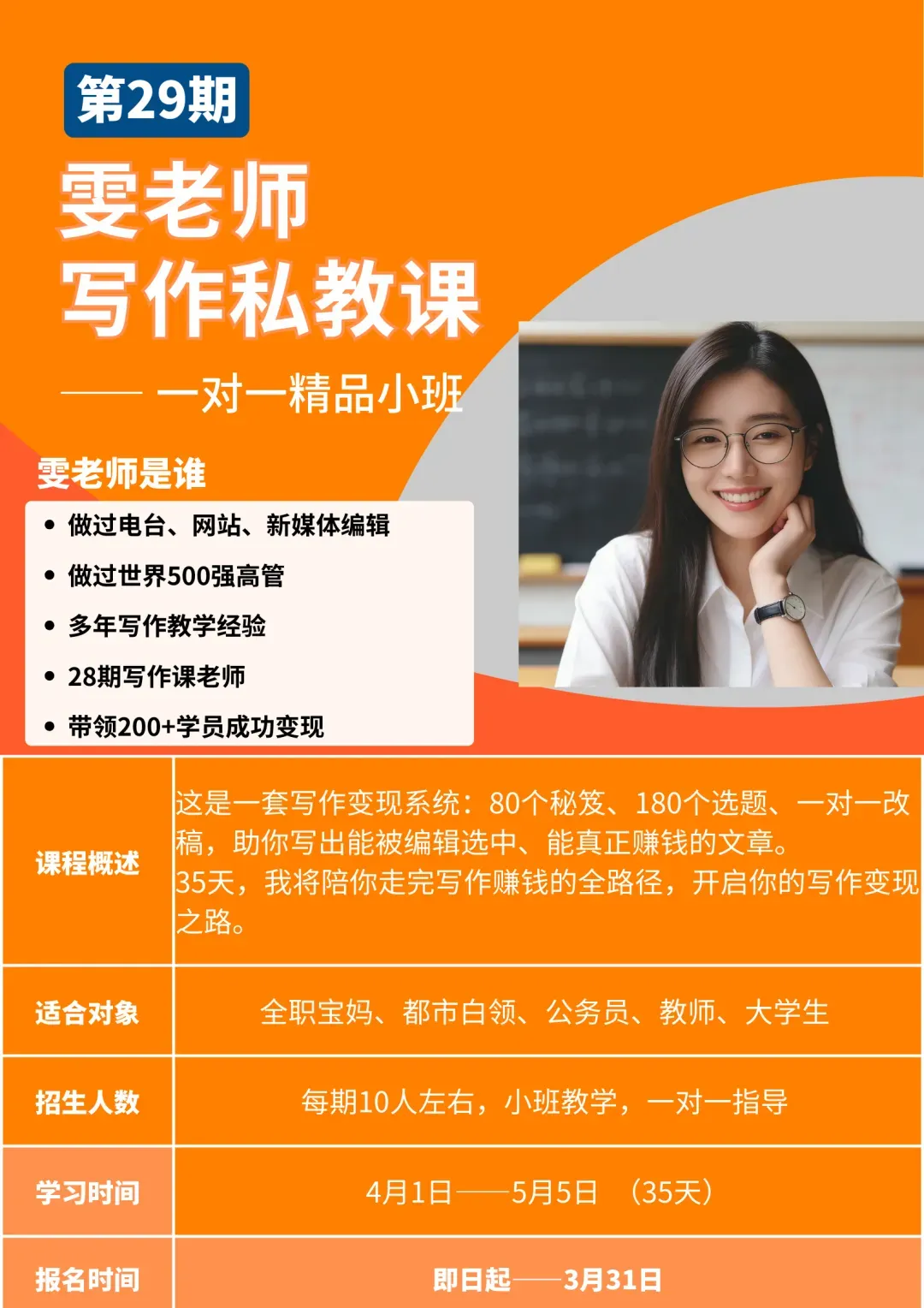 领取方式:直接微信联系我,我会第一时间把全新升级的课件PPT,发给你。另外,领取课件后,不管你在学习过程中遇到任何问题,依然可以微信找我,我会一如既往地耐心解答、用心指导,不会因为课程结束,就断开这份陪伴。愿这份小小的心意,能帮到你们在写作的路上,再创佳绩,收获更多惊喜❤️我是雯老师,做过电台、网站编辑,干过新媒体,做过世界500强高管。儿子三岁时,辞职陪娃。五年前,我开启了一对一写作私教班。