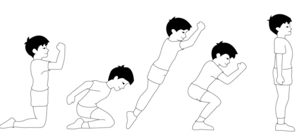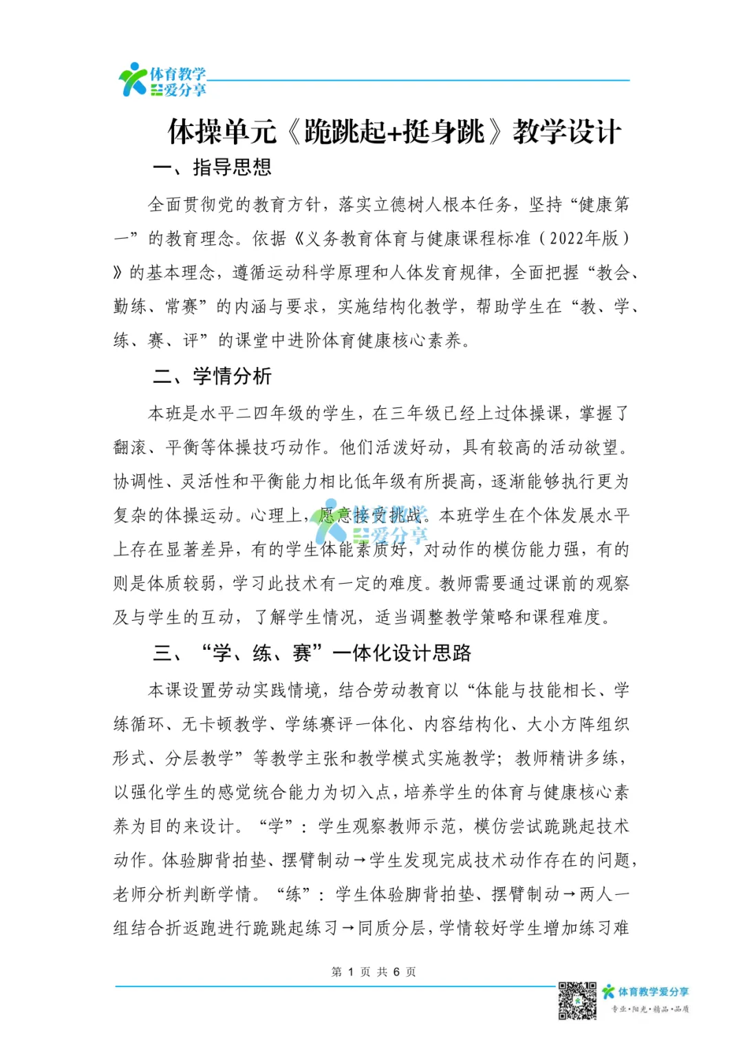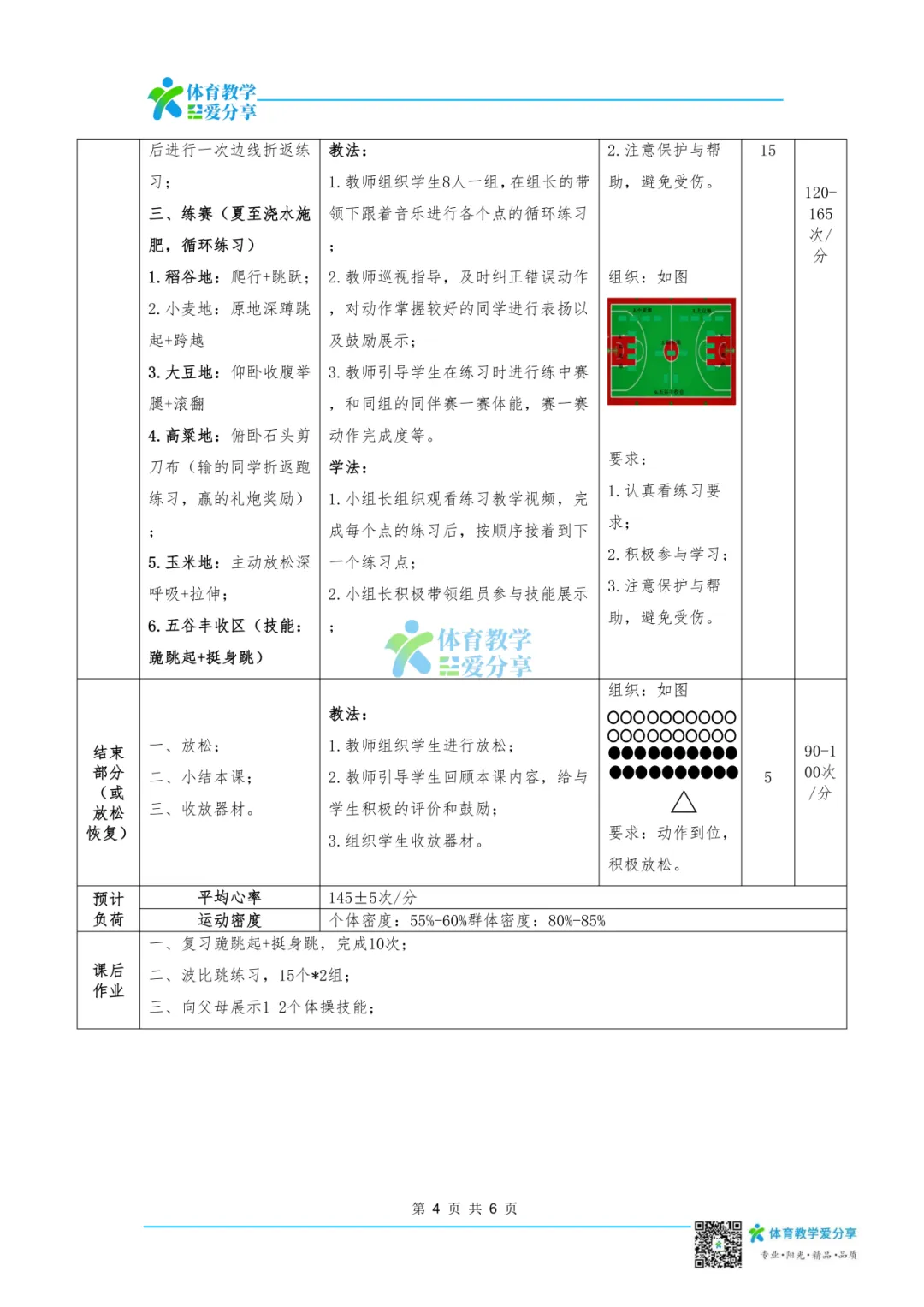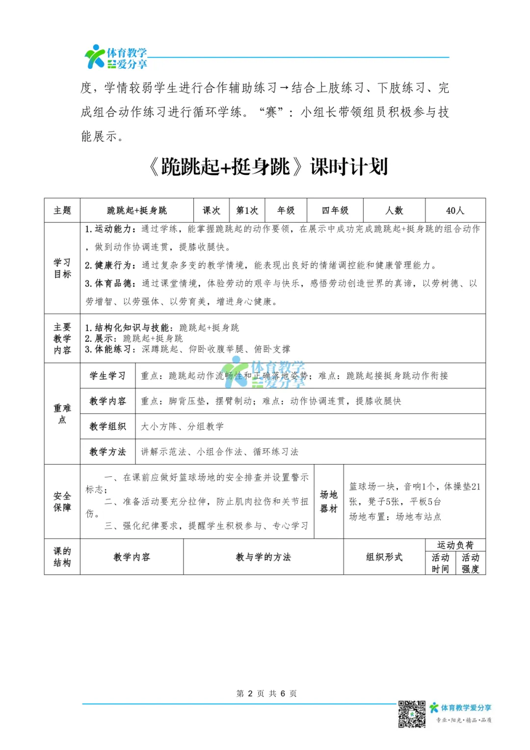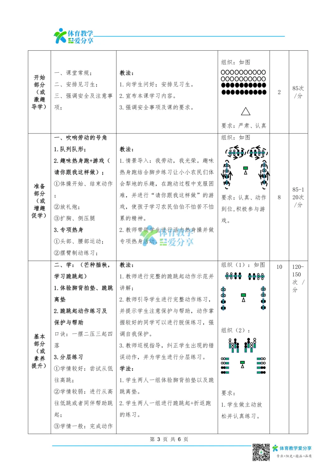 本课设置劳动实践情境,结合劳动教育以“体能与技能相长、学练循环、无卡顿教学、学练赛评一体化、内容结构化、大小方阵组织形式、分层教学”等教学主张和教学模式实施教学;教师精讲多练,以强化学生的感觉统合能力为切入点,培养学生的体育与健康核心素养为目的来设计。“学”:学生观察教师示范,模仿尝试跪跳起技术动作。体验脚背拍垫、摆臂制动→学生发现完成技术动作存在的问题,老师分析判断学情。“练”:学生体验脚背拍垫、摆臂制动→两人一组结合折返跑进行跪跳起练习→同质分层,学情较好学生增加练习难度,学情较弱学生进行合作辅助练习→结合上肢练习、下肢练习、完成组合动作练习进行循环学练。“赛”:小组长带领组员积极参与技能展示。